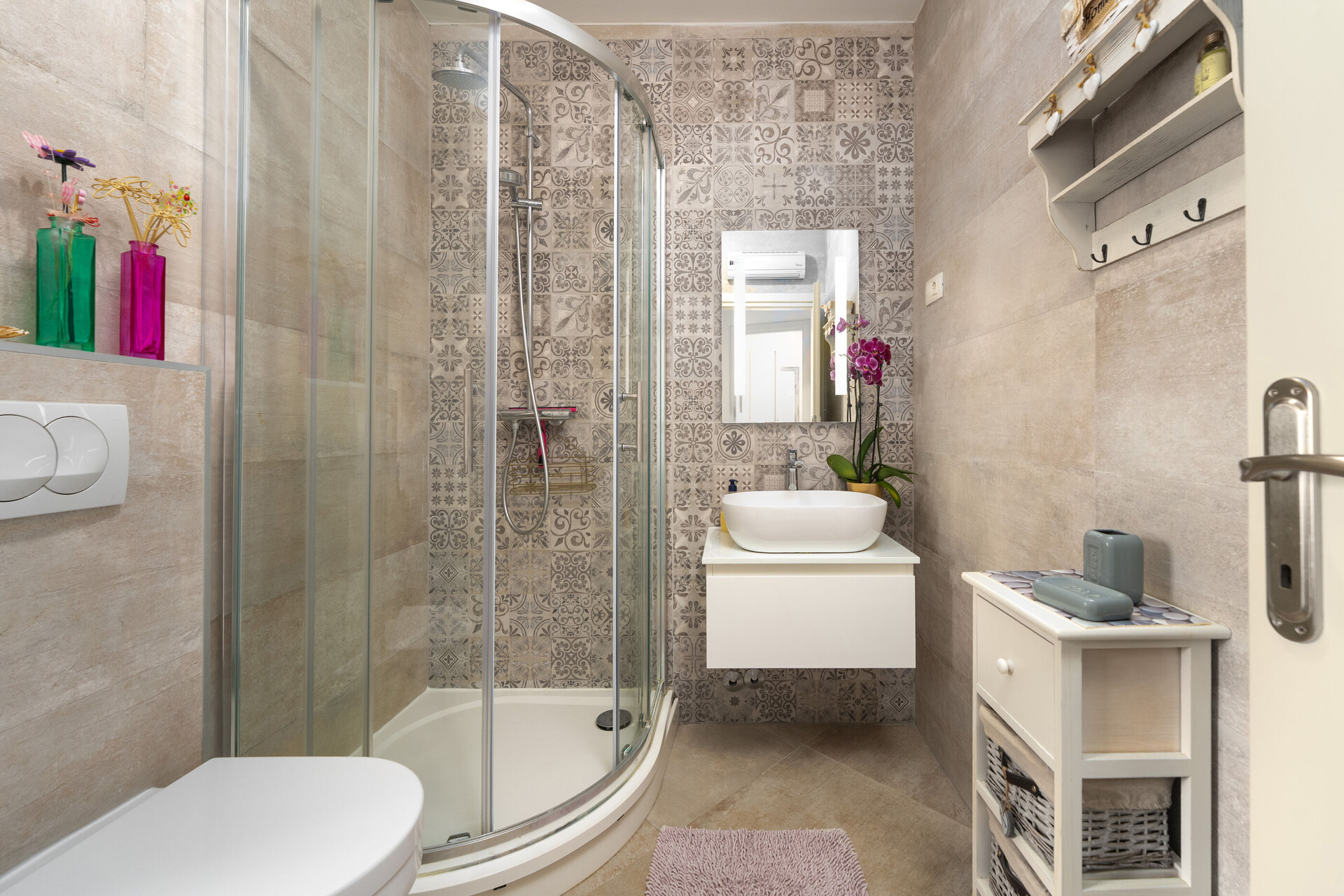 • ducha, cabina de ducha, lavadora, secadora de pelo, toallas.