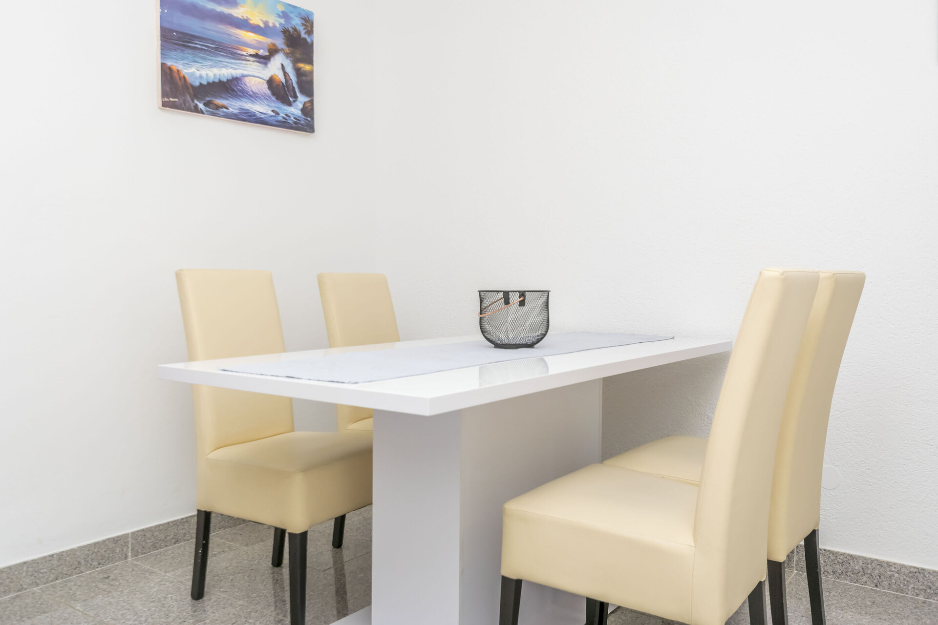 • table et chaises, évier, réfrigérateur, bouilloire, cafetière, micro-ondes, lave-vaiselle, cuisinière.