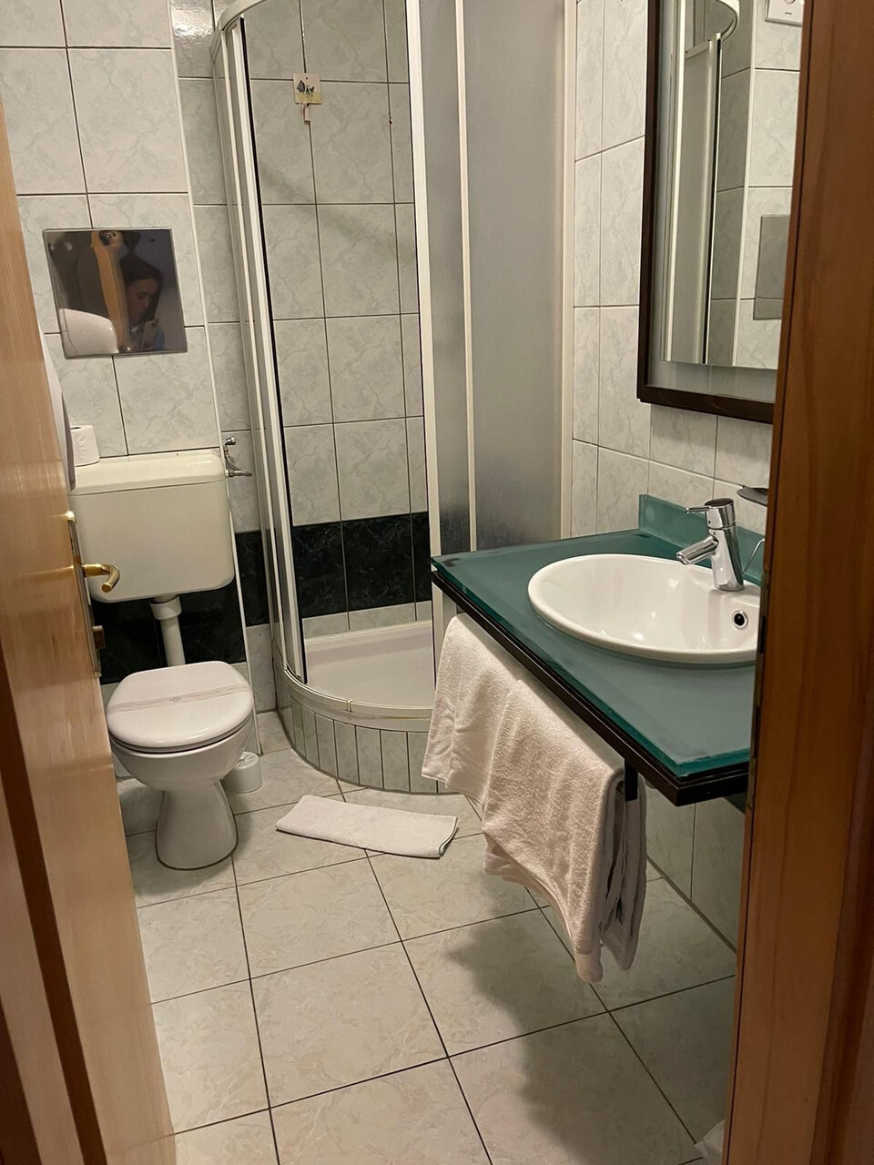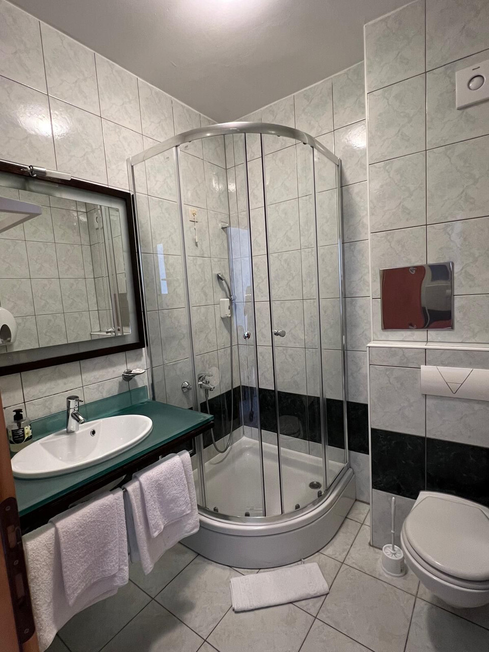 • douche, cabine de douche, sèche-cheveux, serviettes de toilette.