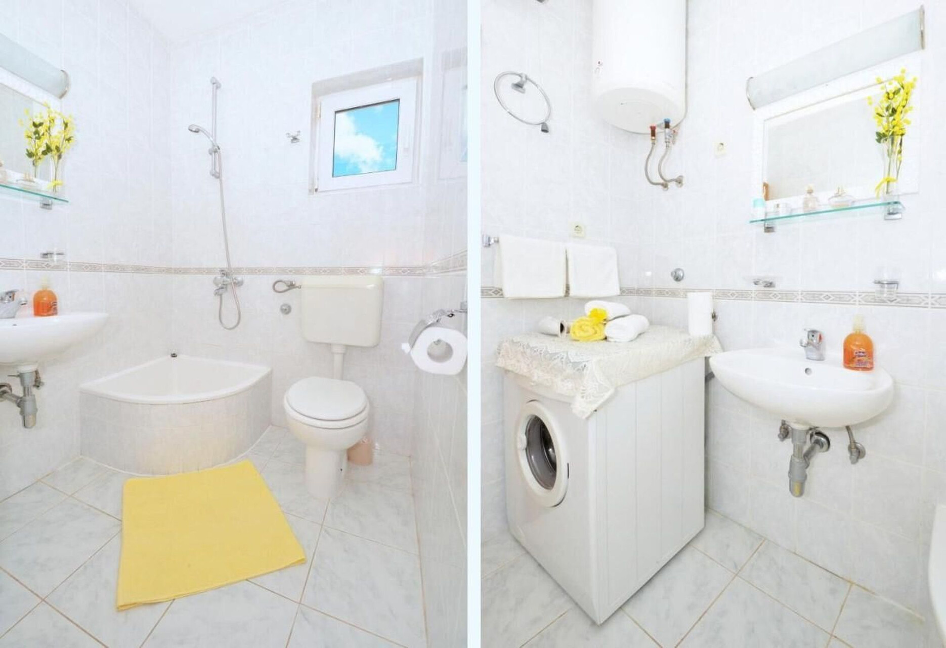 • douche, cabine de douche, machine à laver, serviettes de toilette.