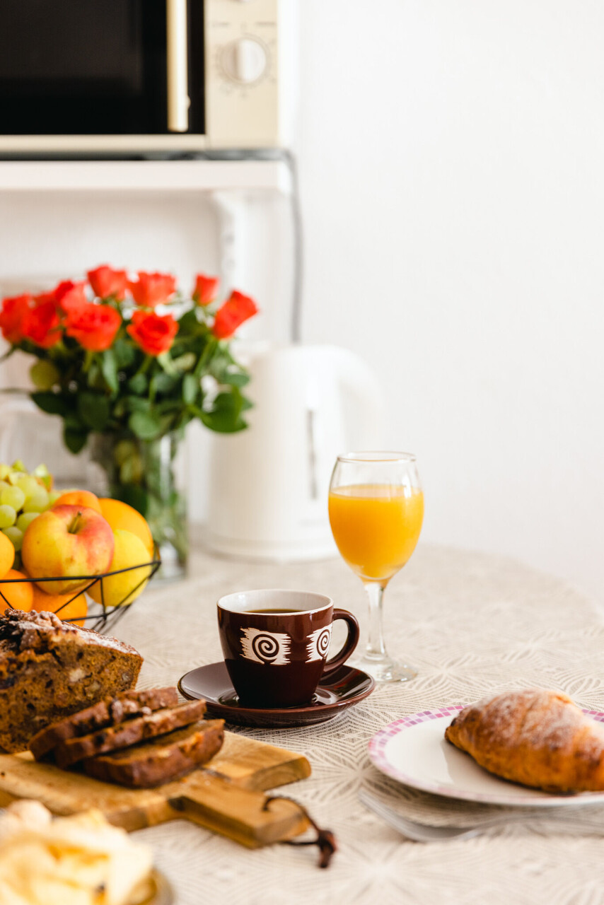 • table et chaises, évier, réfrigérateur, compartiment congélateur, bouilloire, cafetière, micro-ondes, fer à repasser, cuisinière.
