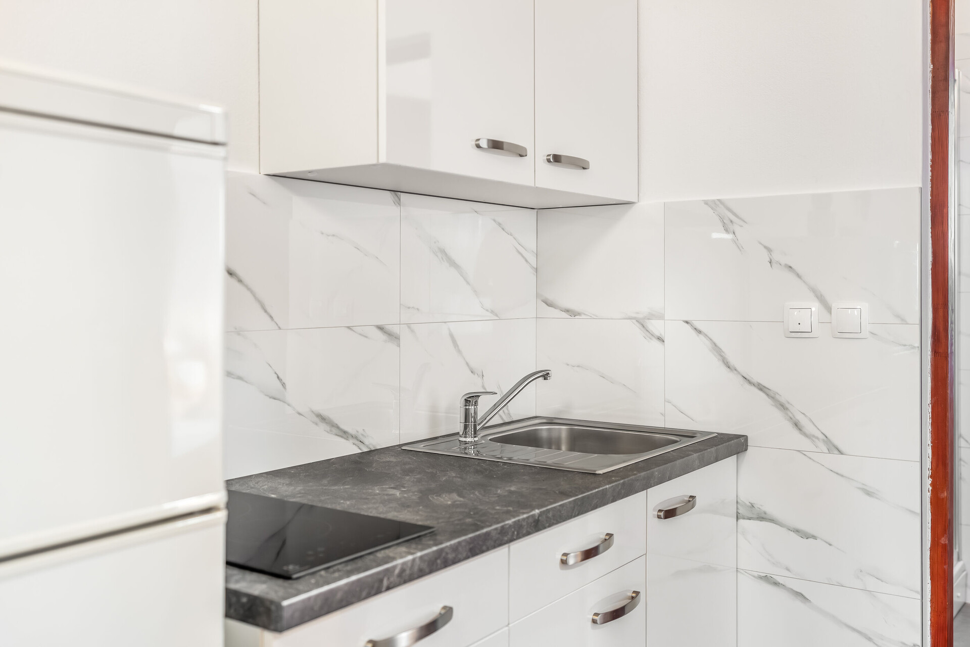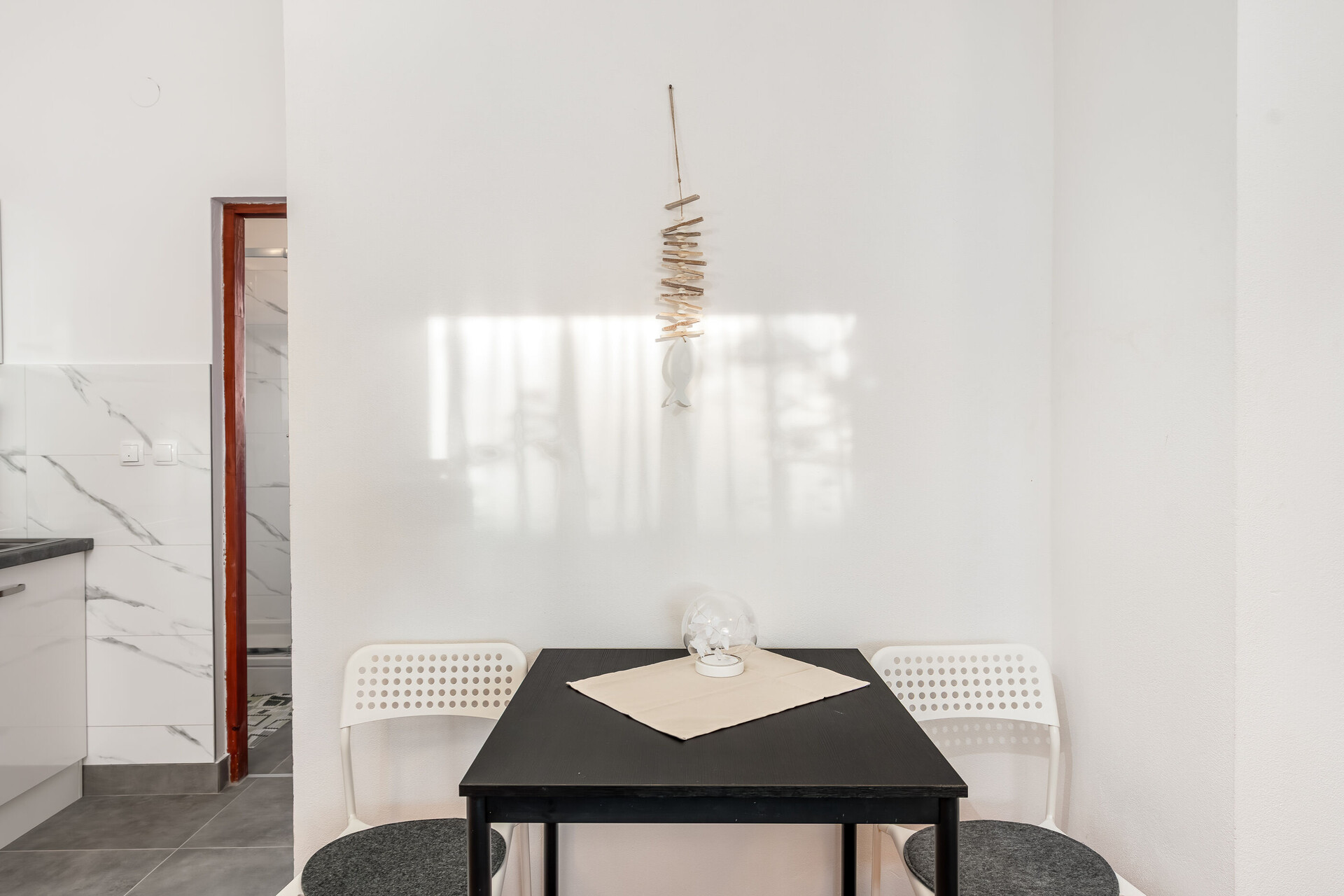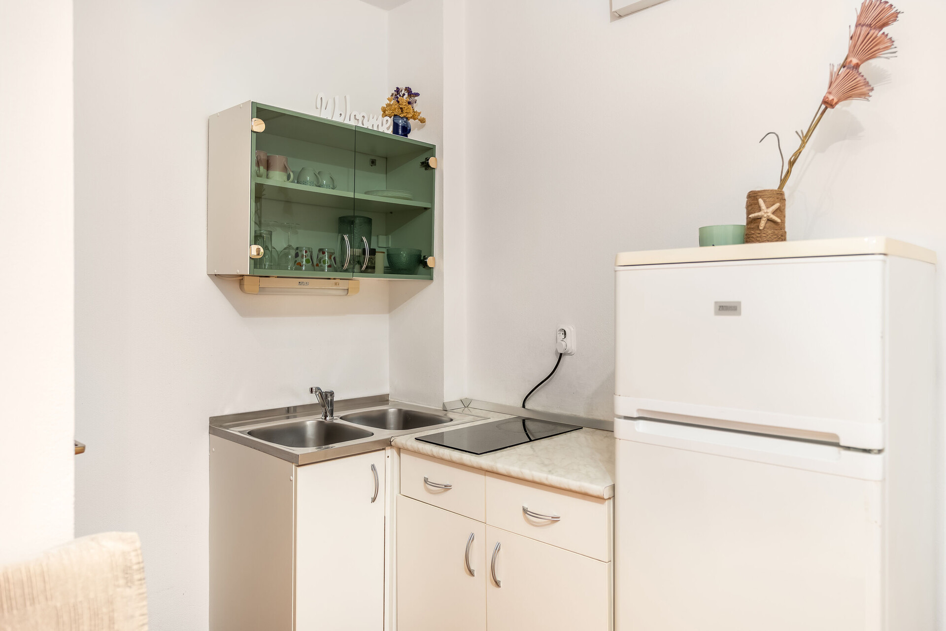 • table et chaises, évier, réfrigérateur, compartiment congélateur, cafetière, cuisinière.
