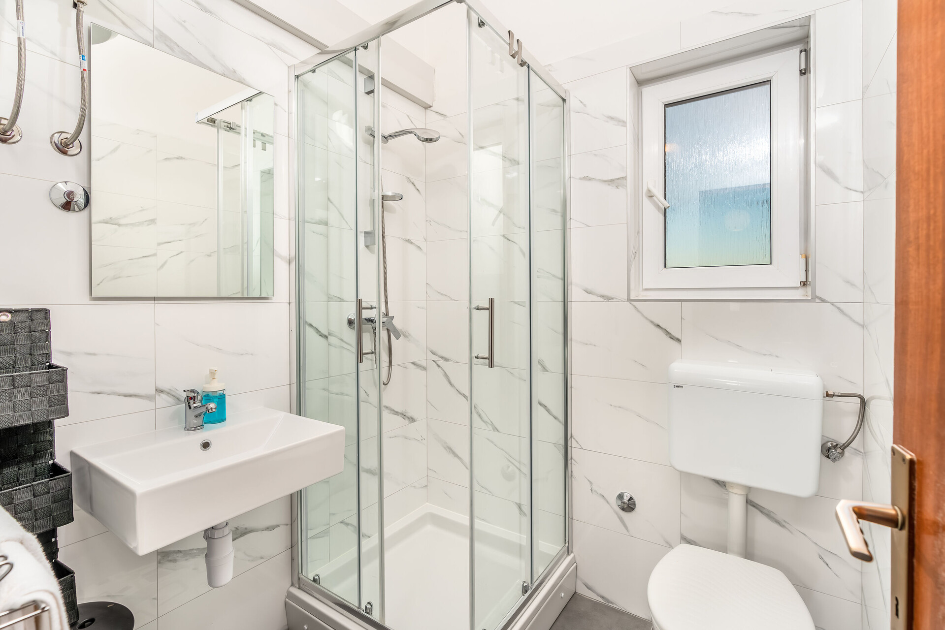 • douche, cabine de douche, serviettes de toilette.