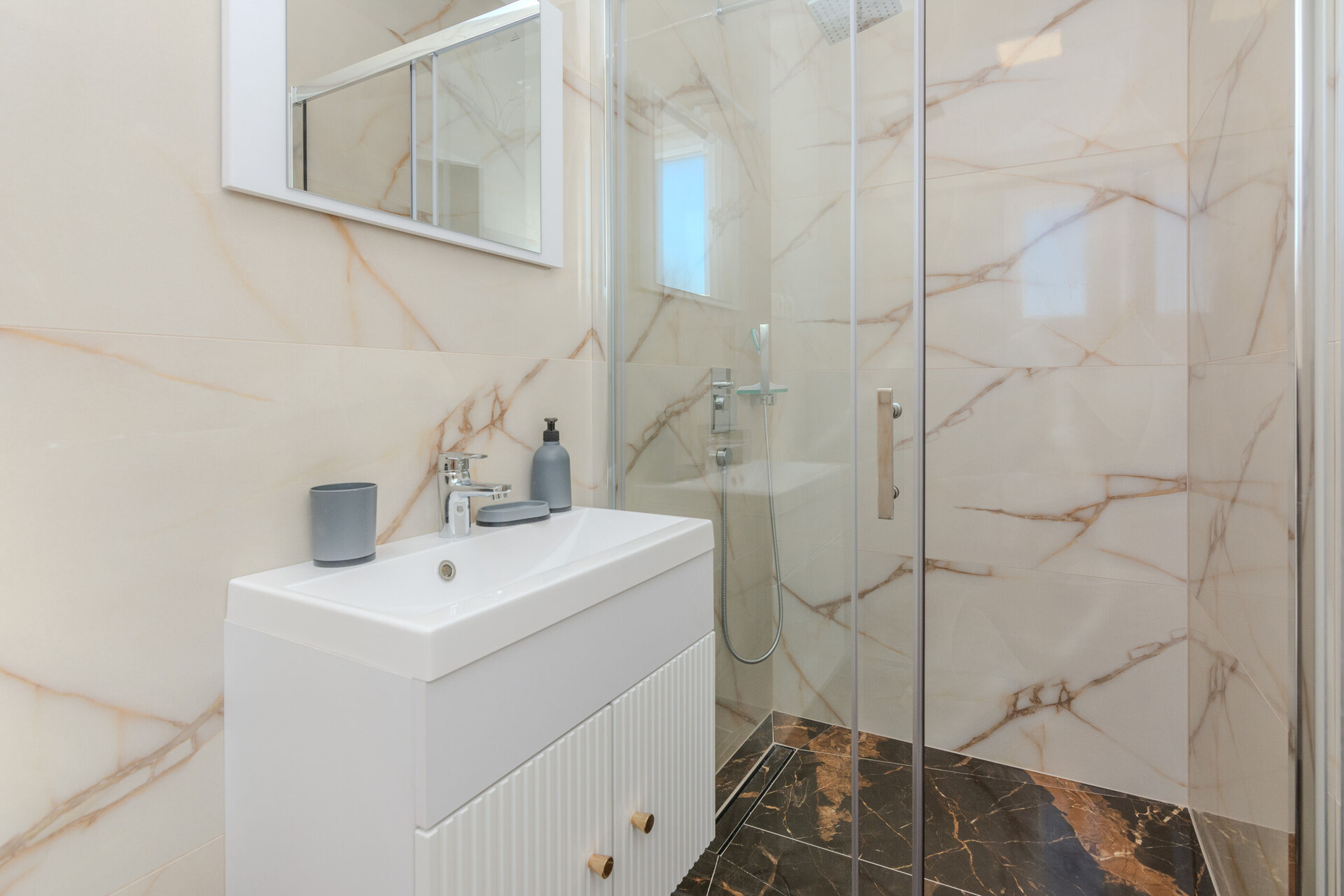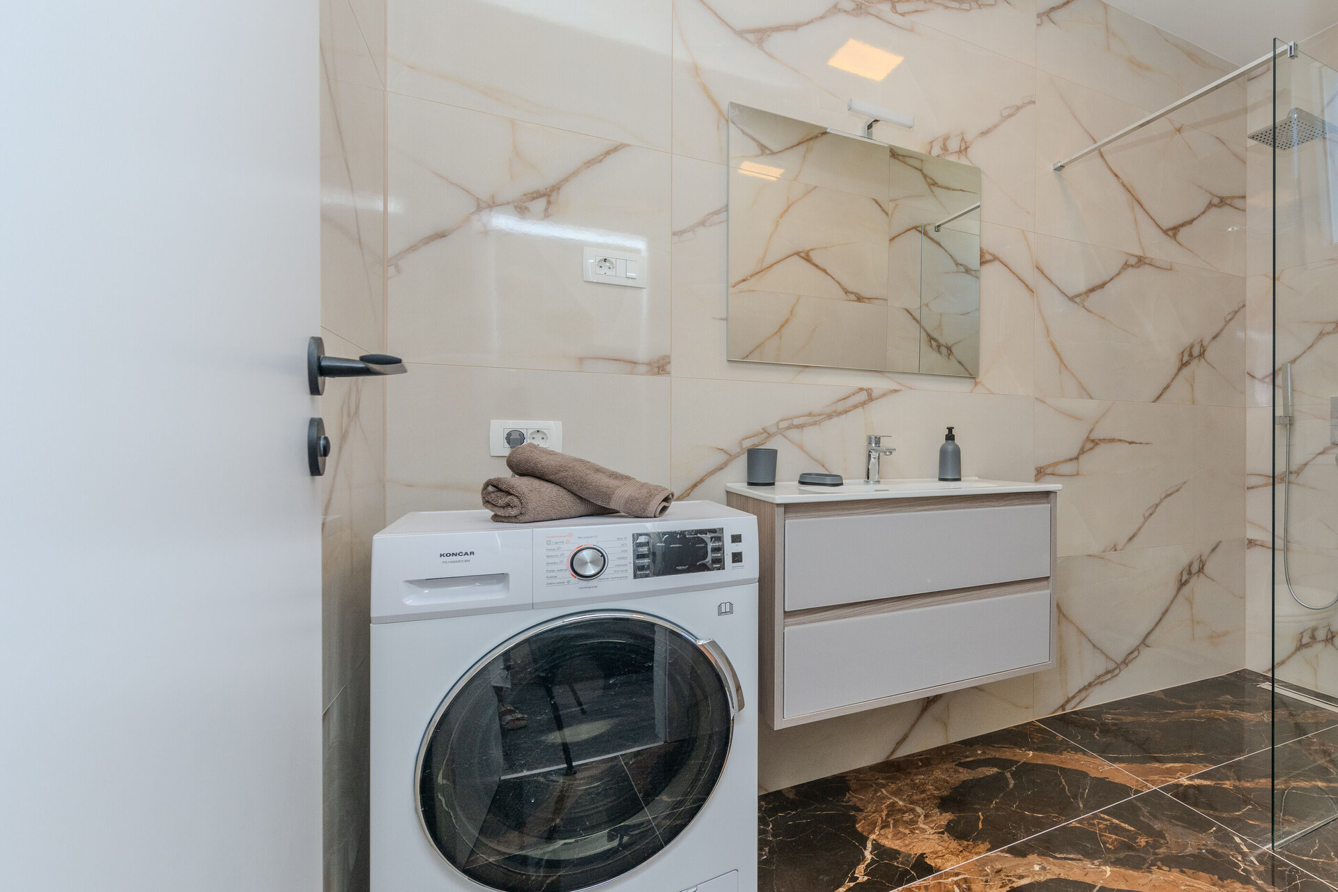 • douche, cabine de douche, machine à laver, sèche-cheveux, serviettes de toilette.