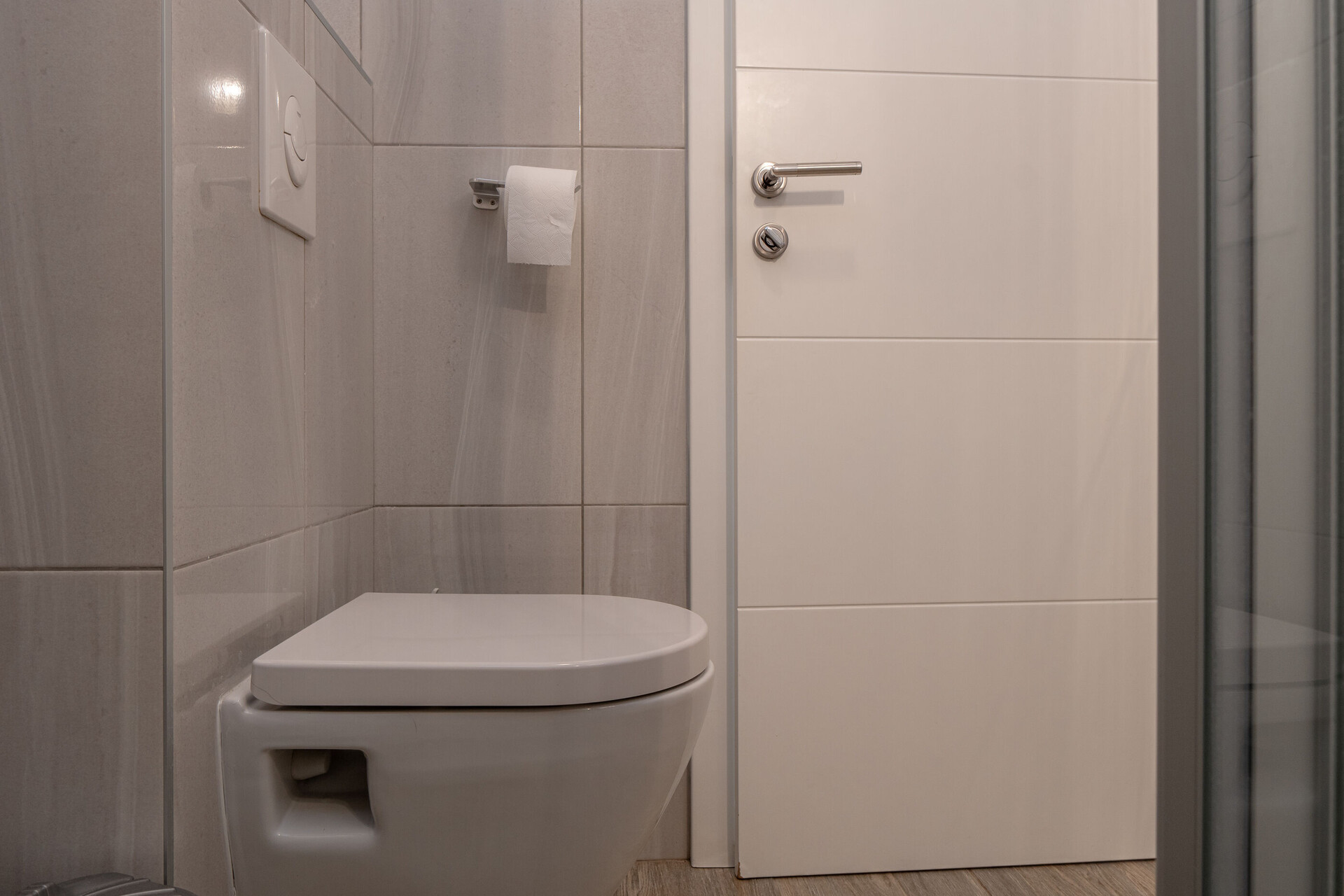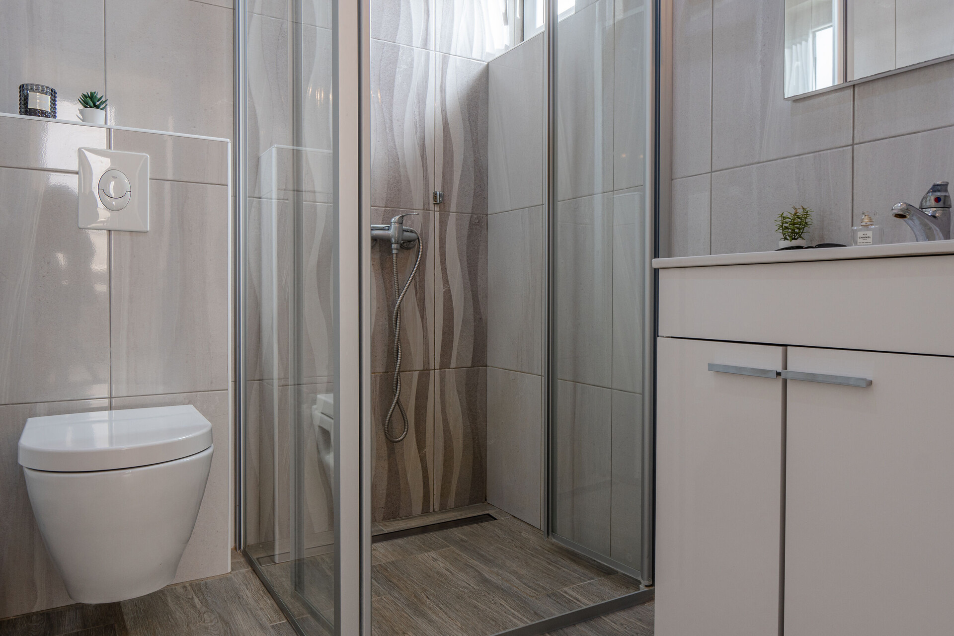 • douche, cabine de douche, machine à laver, sèche-cheveux, serviettes de toilette.
