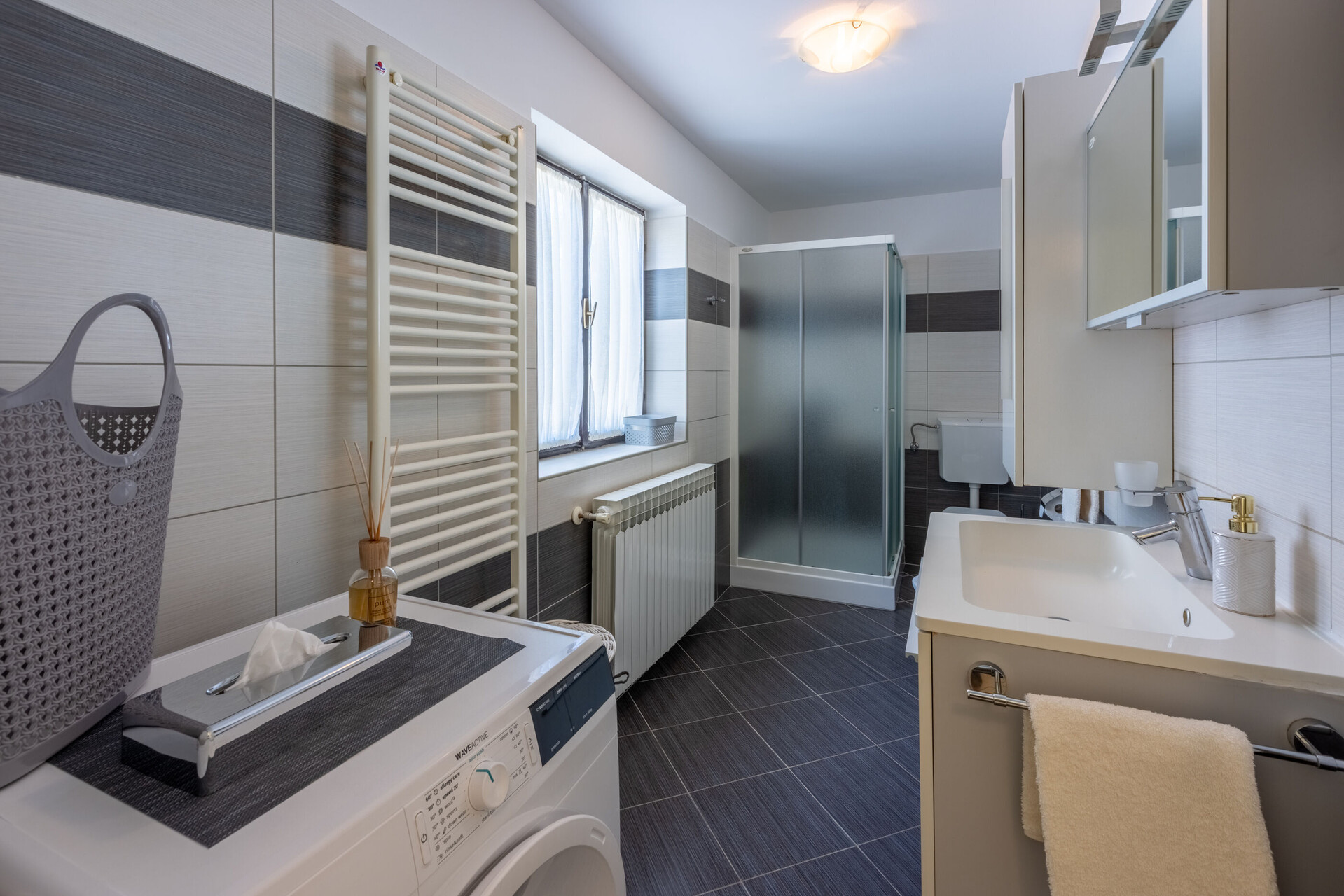 • douche, cabine de douche, machine à laver, sèche-cheveux, serviettes de toilette.