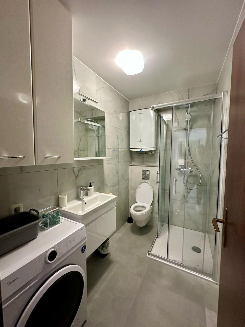 • douche, cabine de douche, machine à laver, sèche-cheveux, serviettes de toilette.