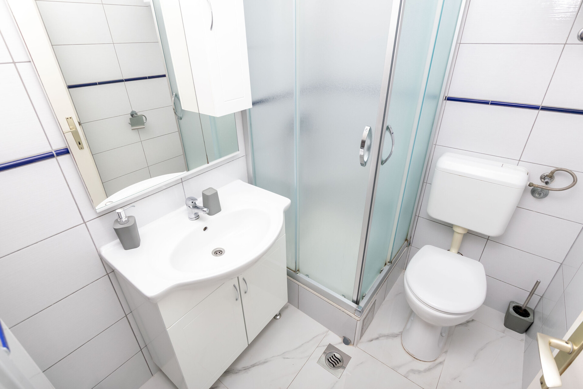 • shower, shower enclosure, washing machine, hairdryer, towels.