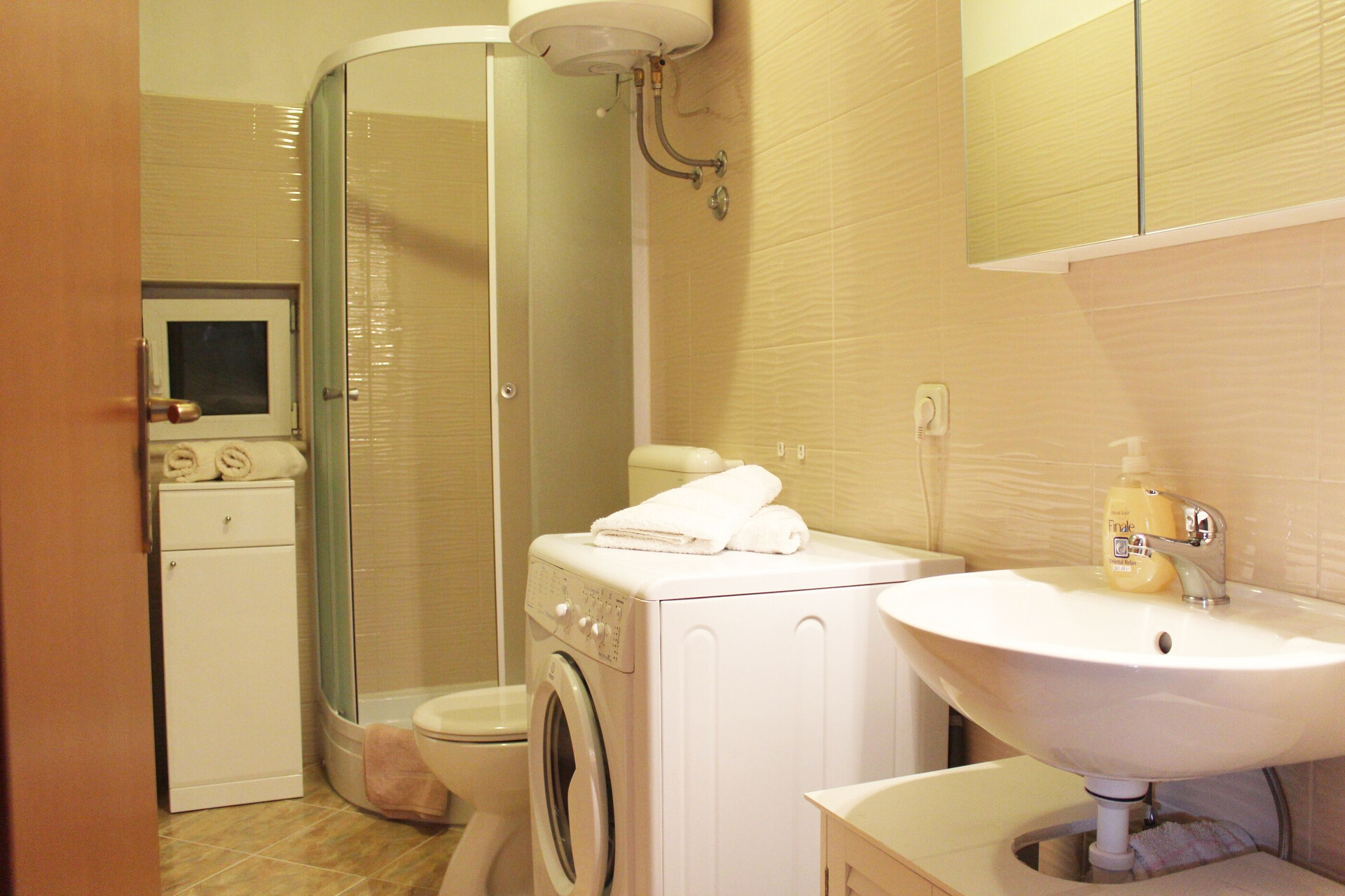 • shower, shower enclosure, washing machine, hairdryer, towels.