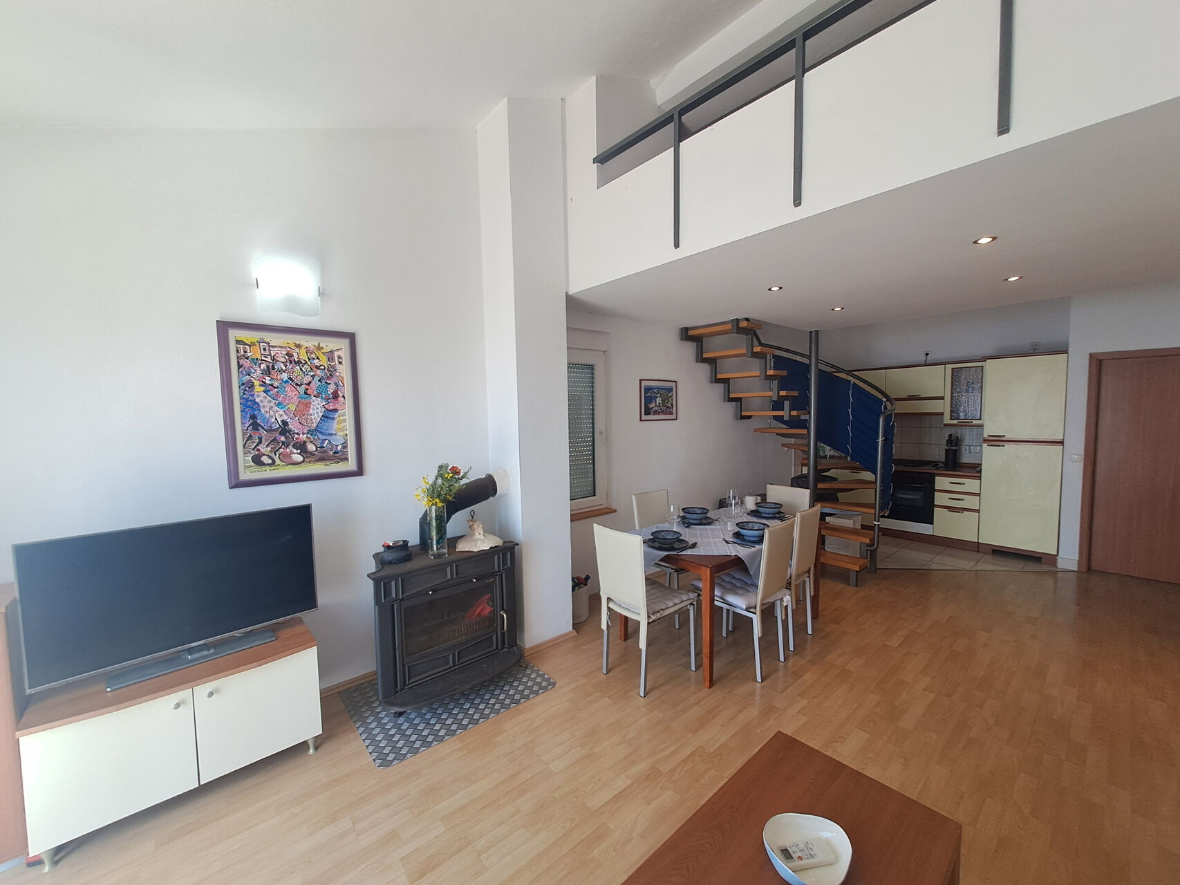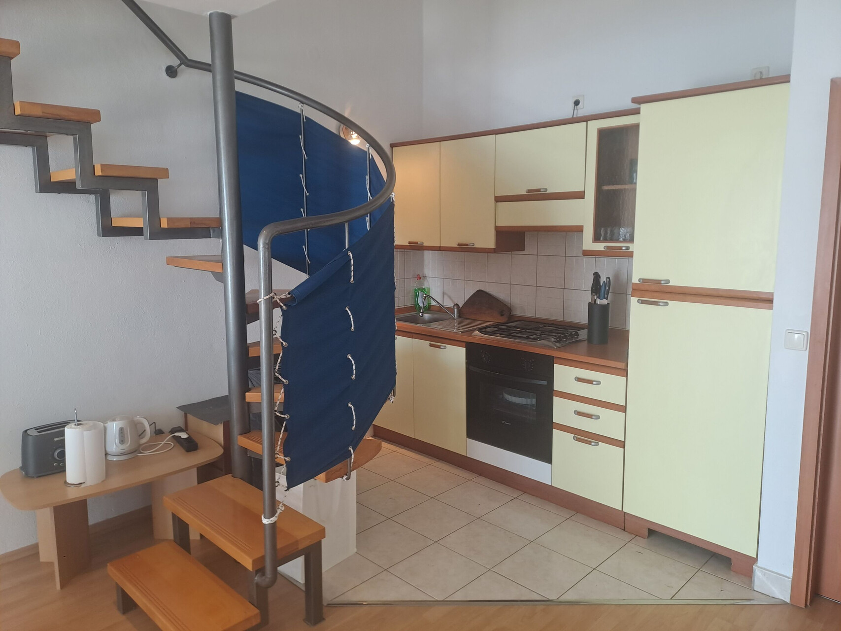 • table and chairs, kitchen sink, oven, refrigerator, upright freezer, electric kettle, filter coffee machine, stove cooktop.