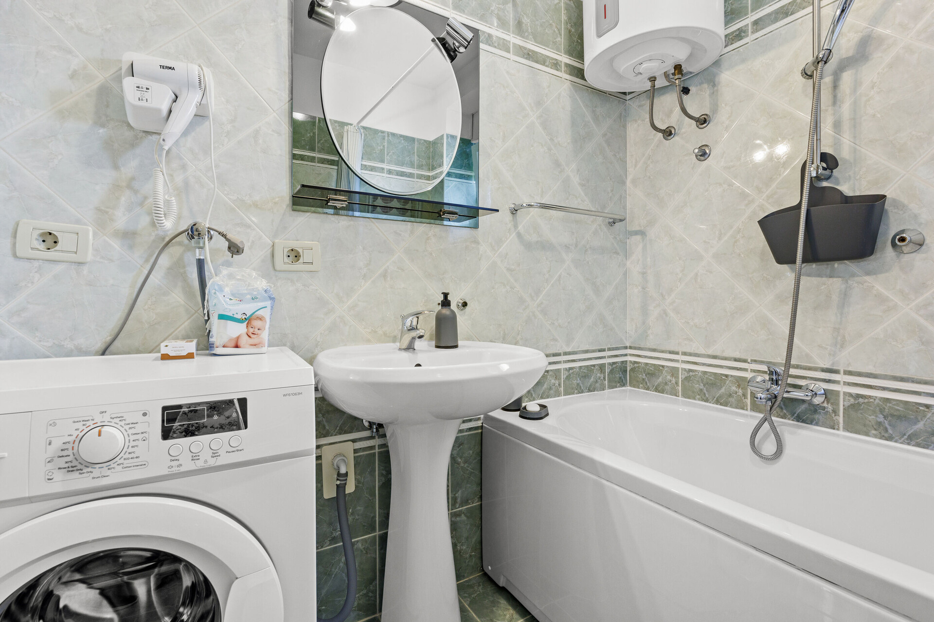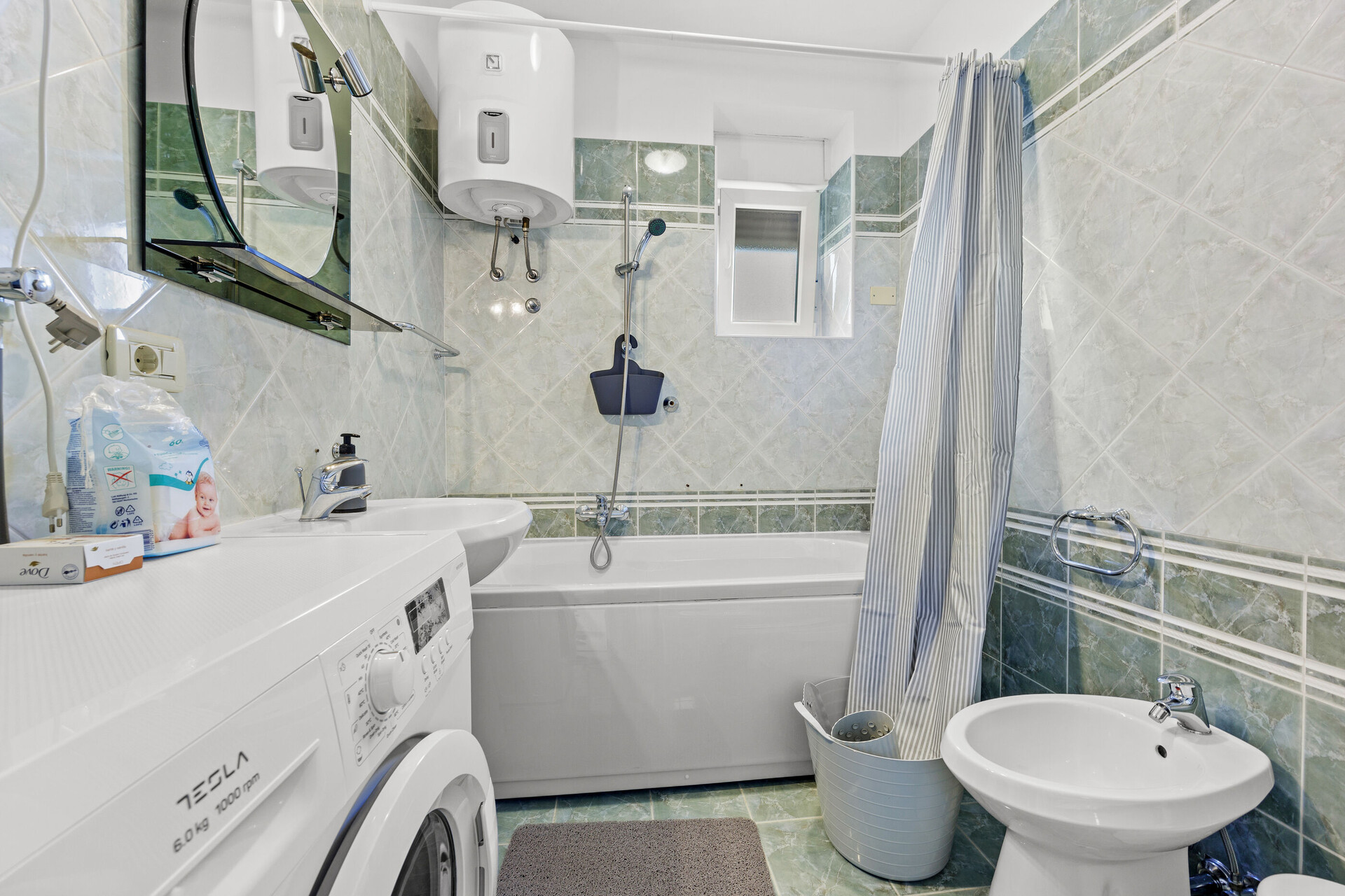• bathtub, washing machine, hairdryer, towels.