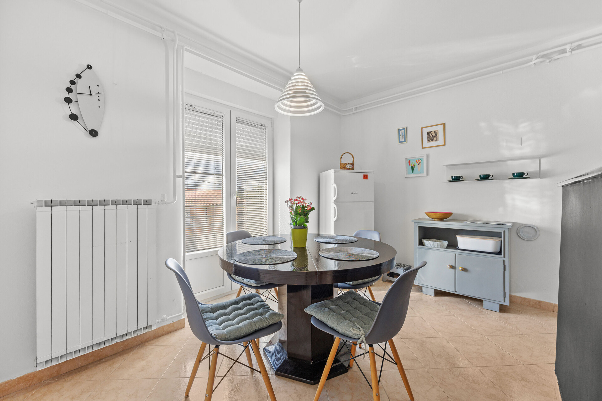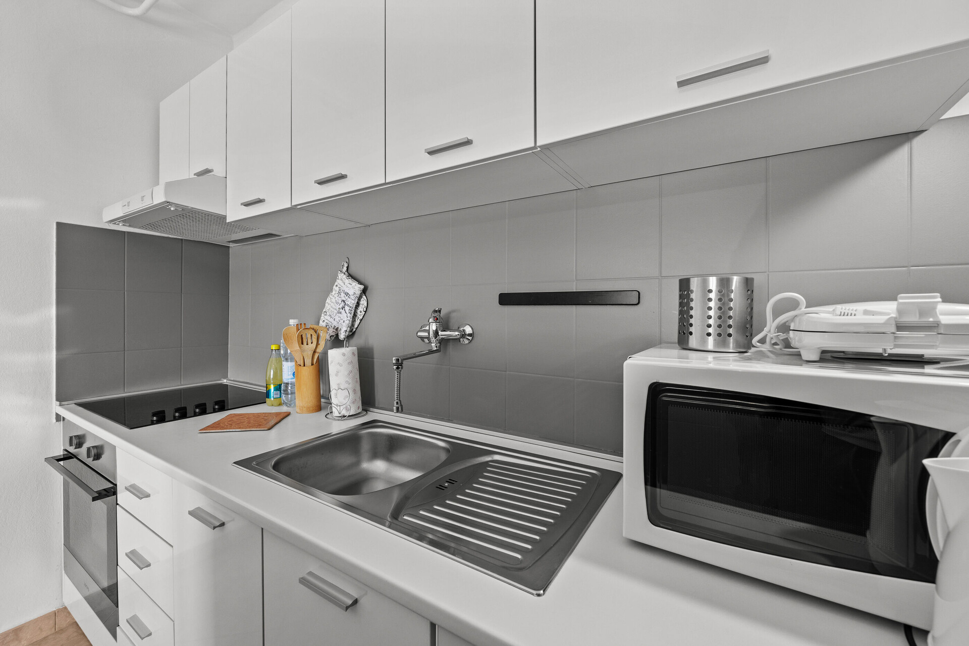 • table and chairs, kitchen sink, oven, refrigerator, upright freezer, electric kettle, filter coffee machine, microwave oven, toaster, dishwasher, iron, stove cooktop.