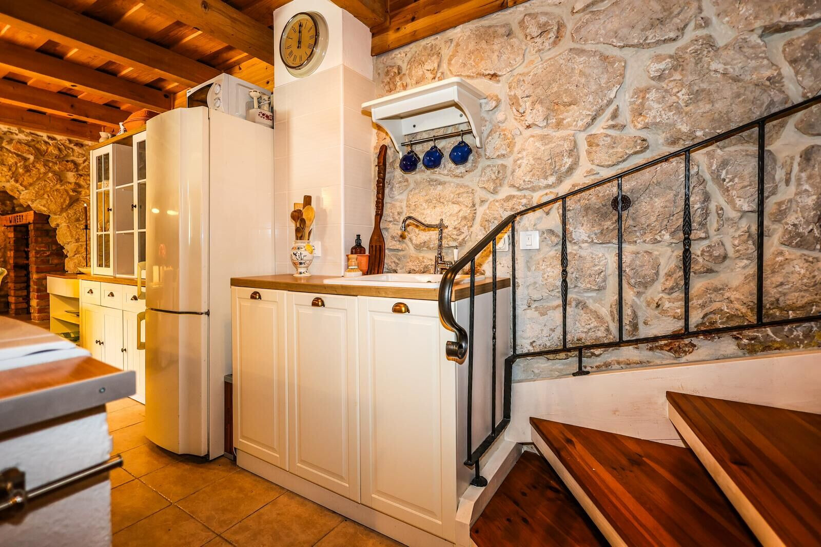 • table and chairs, kitchen sink, oven, refrigerator, upright freezer, electric kettle, filter coffee machine, microwave oven, toaster, dishwasher, iron, stove cooktop.