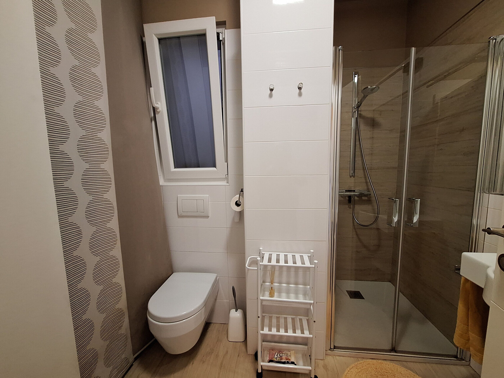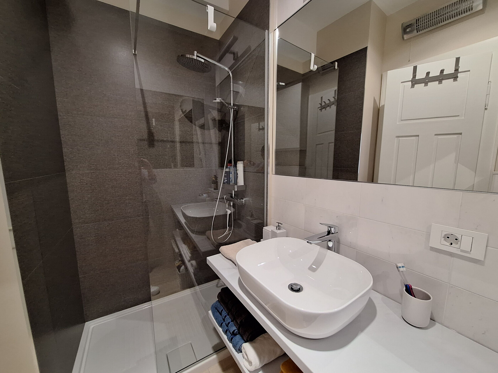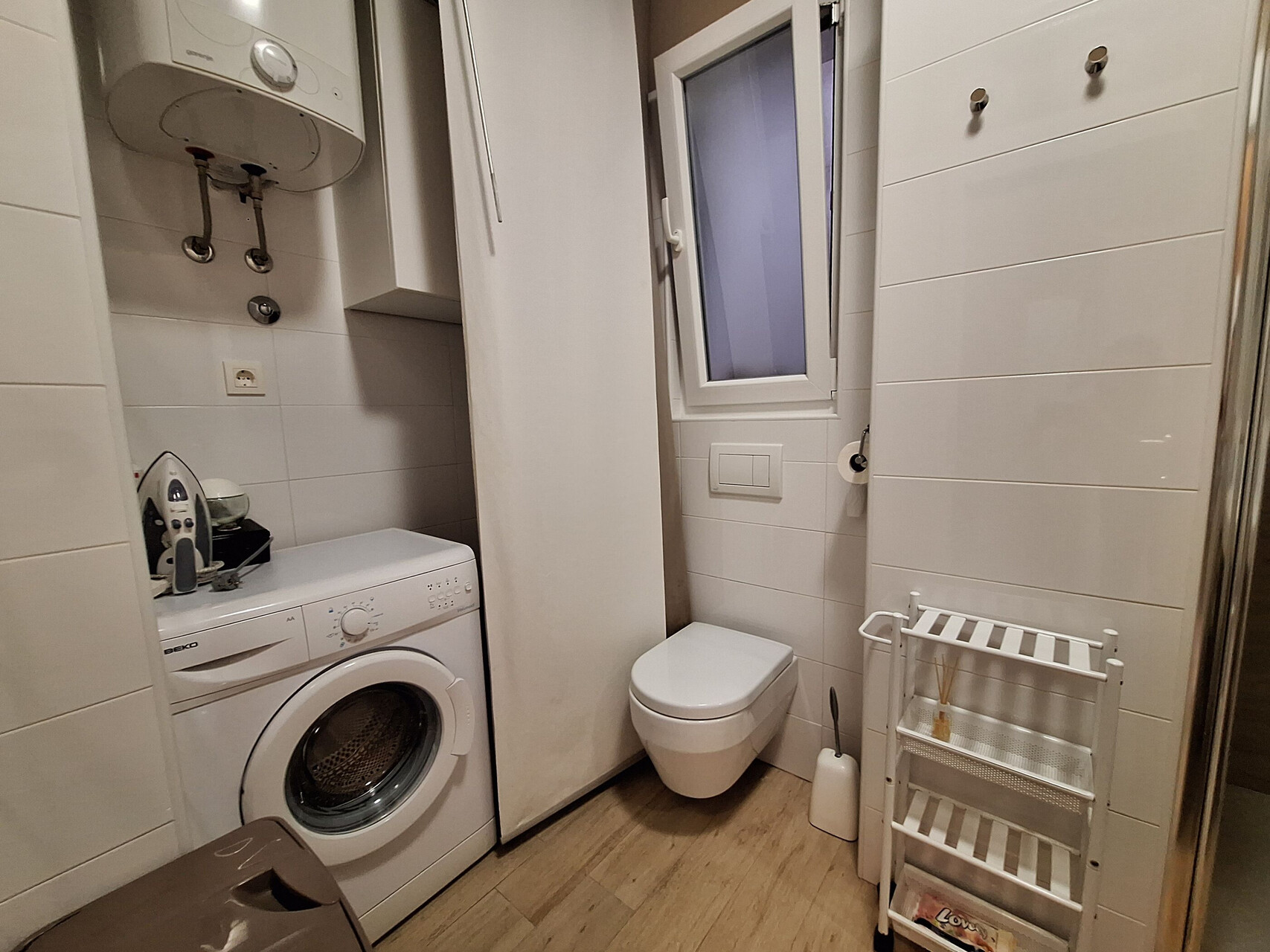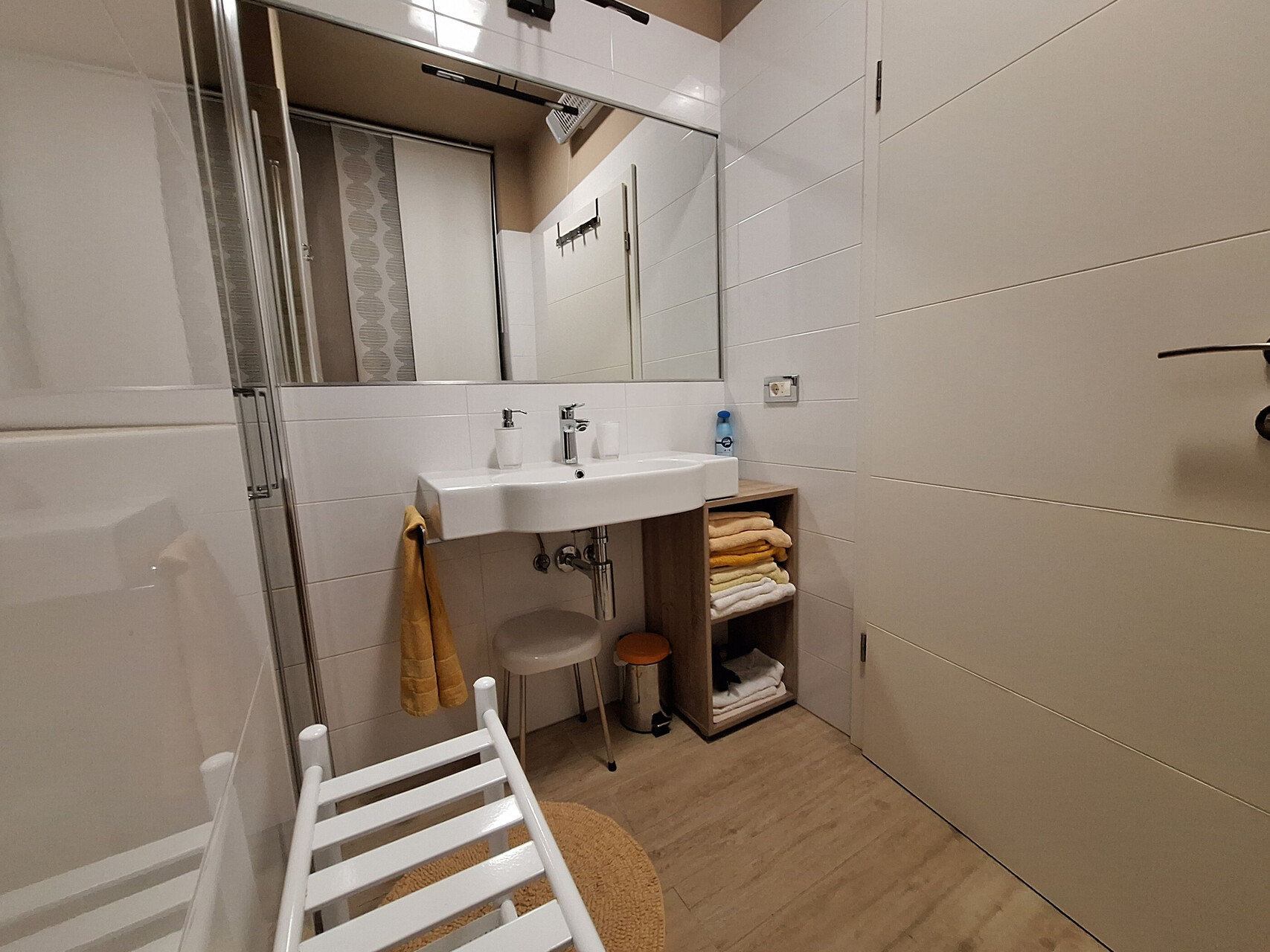 • shower, shower enclosure, washing machine, hairdryer, towels.