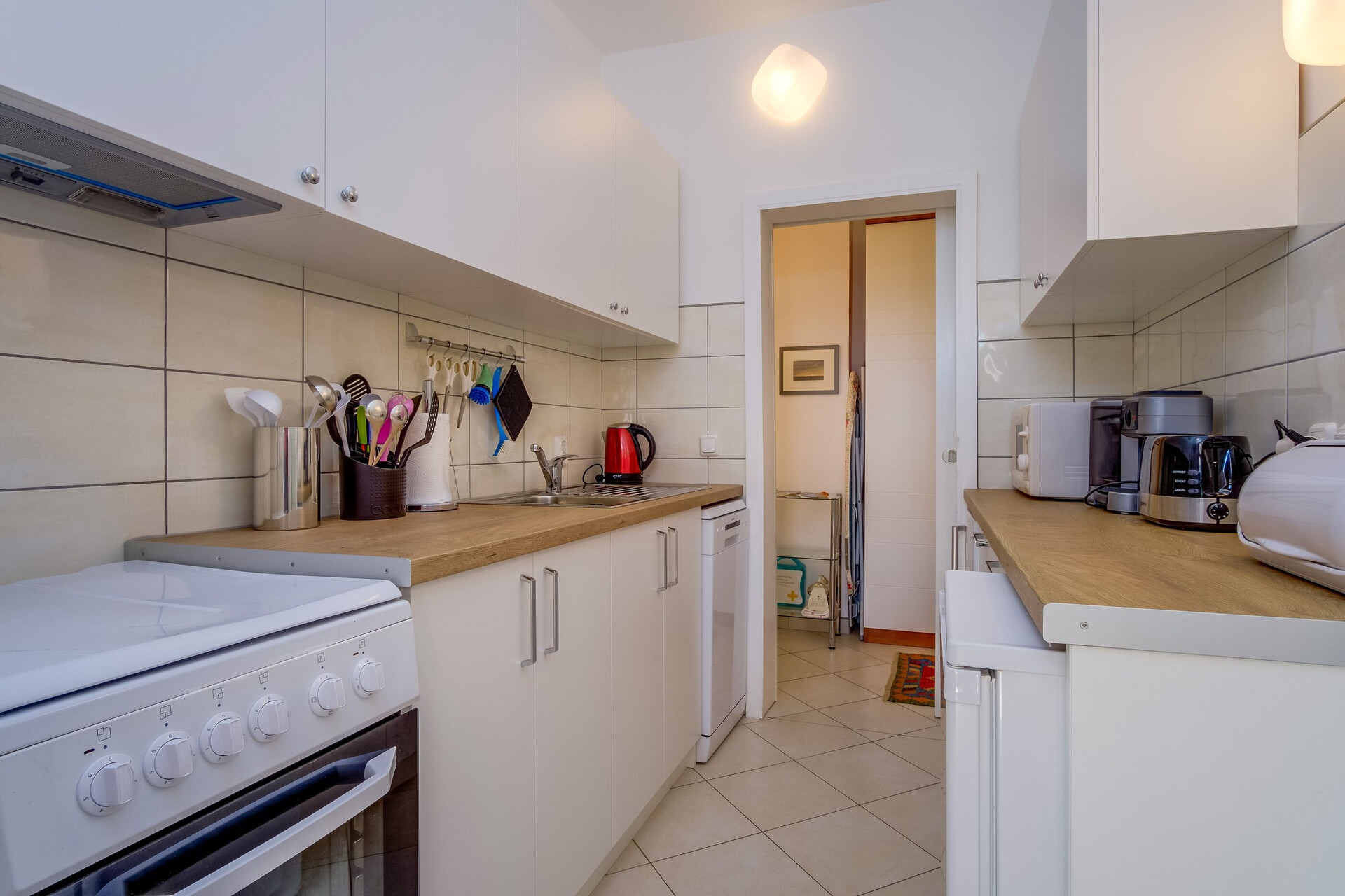 • table and chairs, kitchen sink, oven, refrigerator, upright freezer, filter coffee machine, dishwasher.