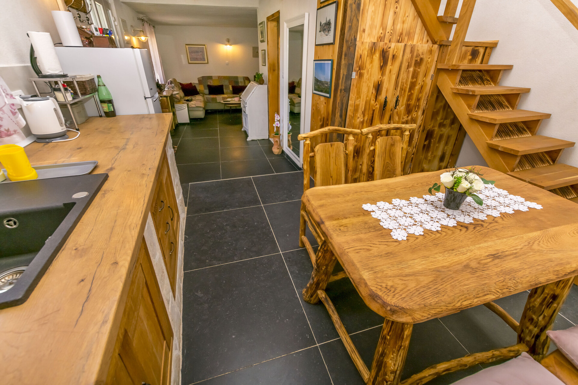 • table and chairs, kitchen sink, oven, refrigerator, iron.