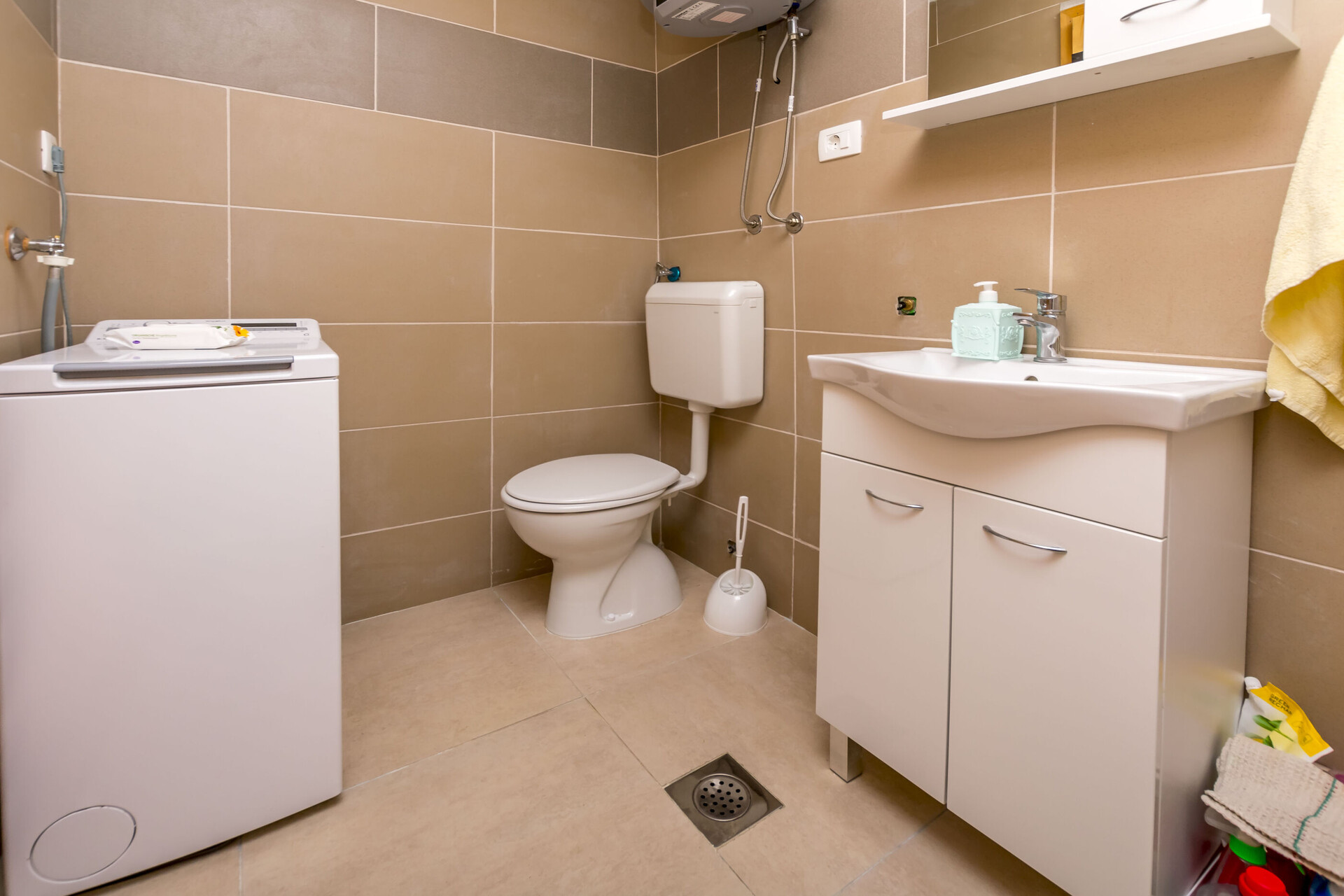 • shower, shower enclosure, washing machine, towels.