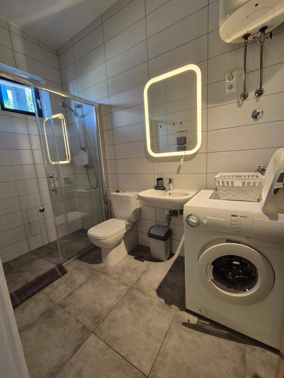 • shower, shower enclosure, washing machine, hairdryer, towels.