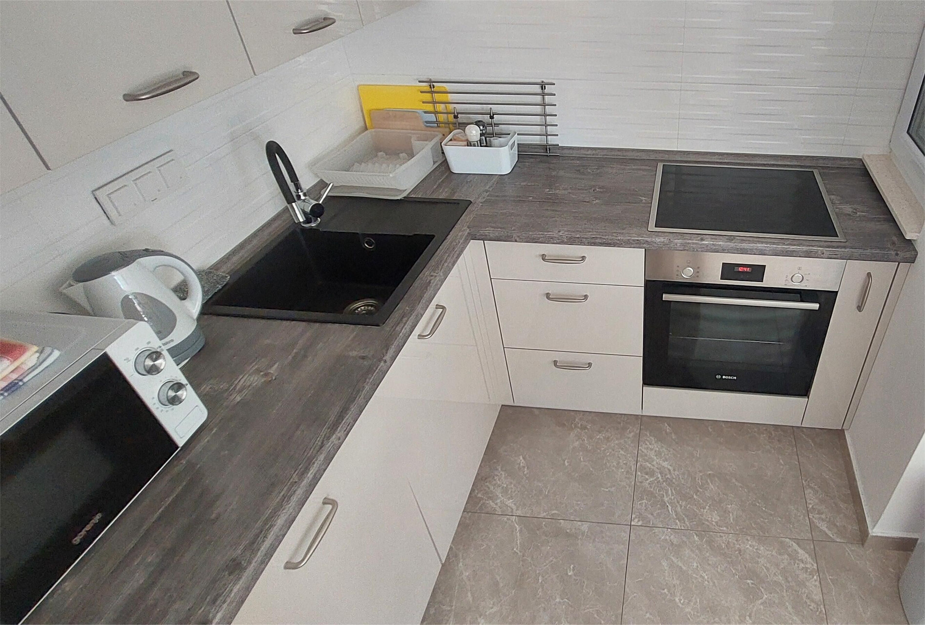 • table and chairs, kitchen sink, oven, refrigerator, upright freezer, electric kettle, filter coffee machine, microwave oven, dishwasher, iron, stove cooktop.