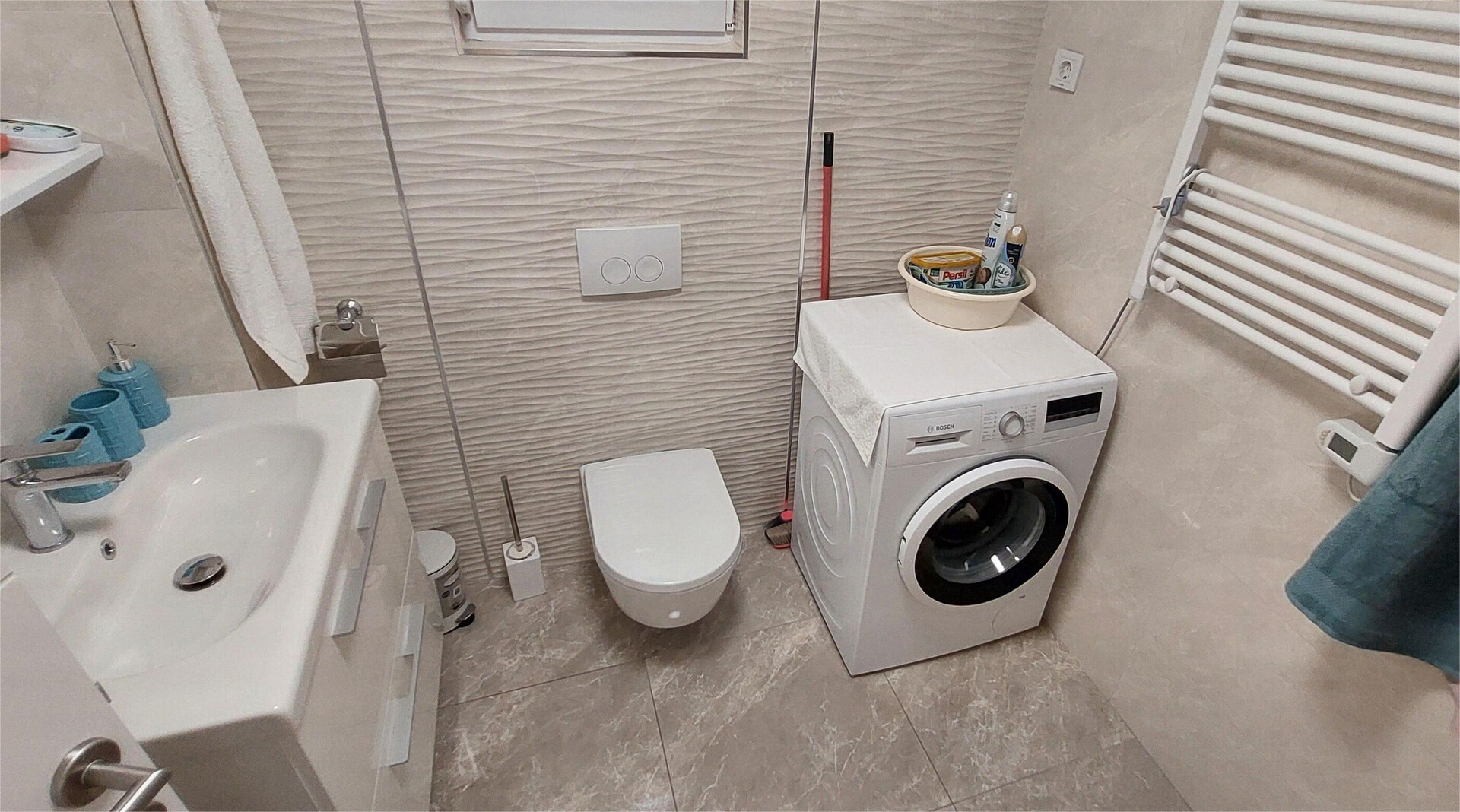 • shower, shower enclosure, washing machine, hairdryer, towels.