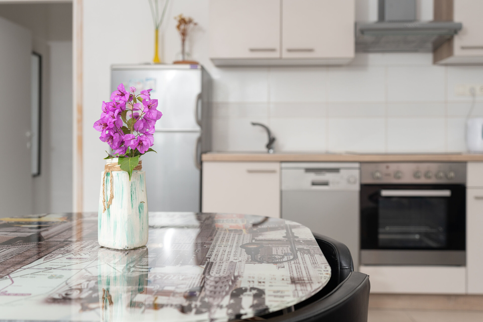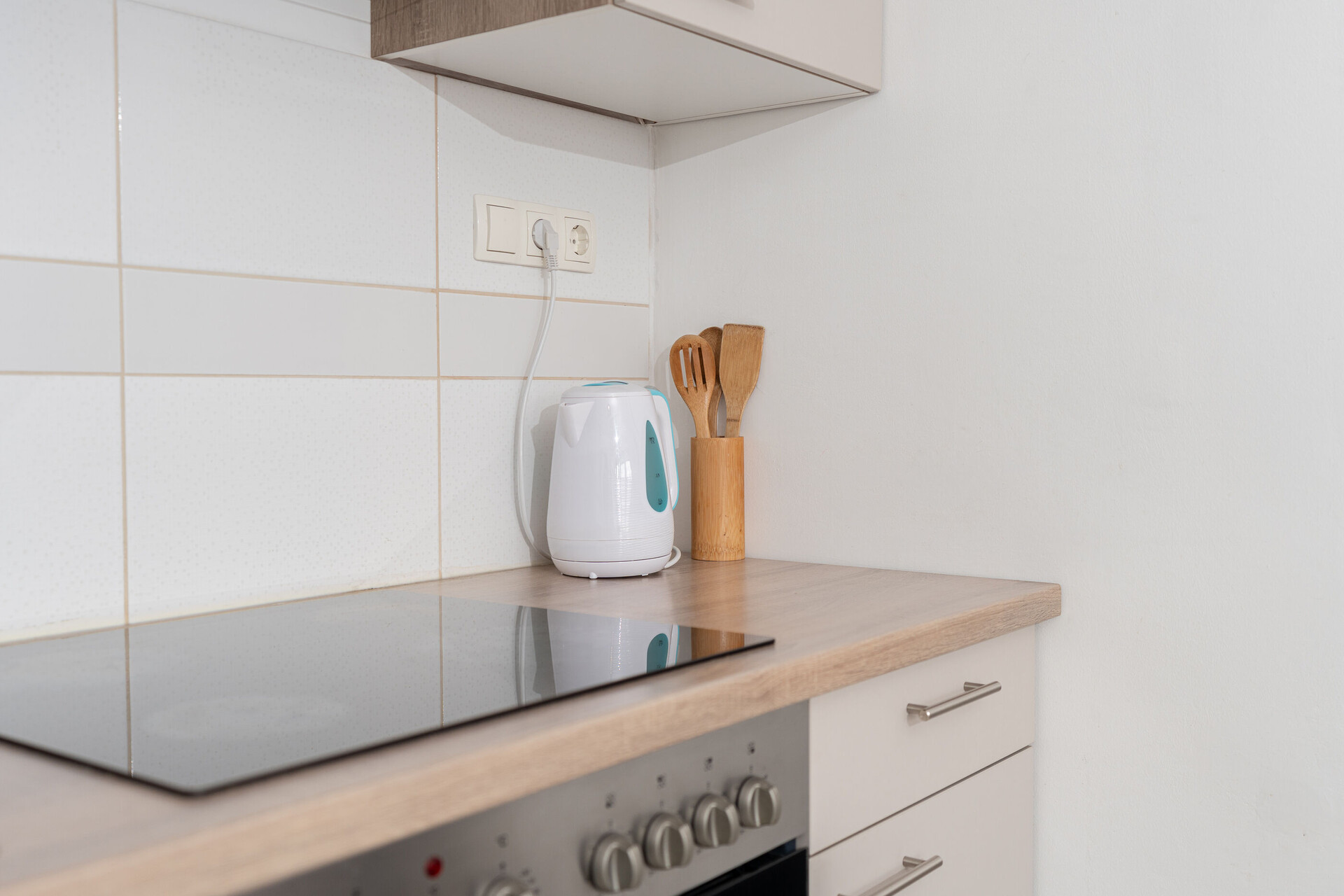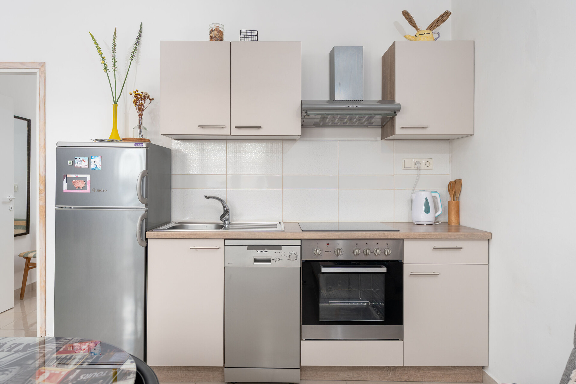 • table and chairs, kitchen sink, oven, refrigerator, upright freezer, electric kettle, filter coffee machine, toaster, dishwasher, stove cooktop.
