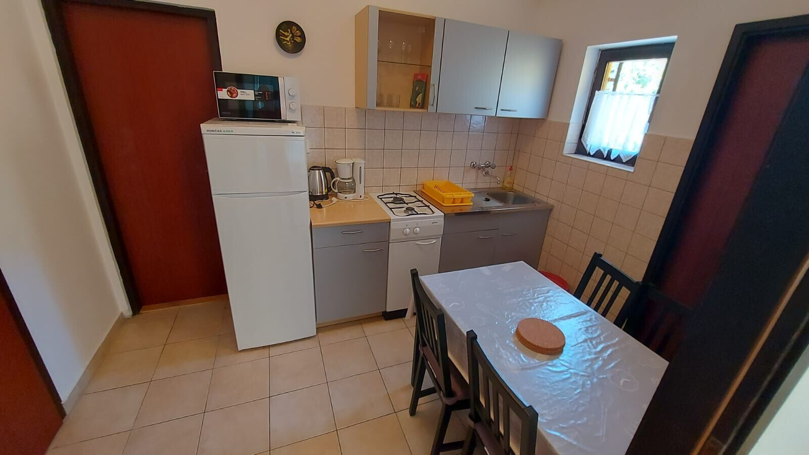 • table and chairs, kitchen sink, refrigerator, upright freezer, electric kettle, filter coffee machine, microwave oven, stove cooktop.