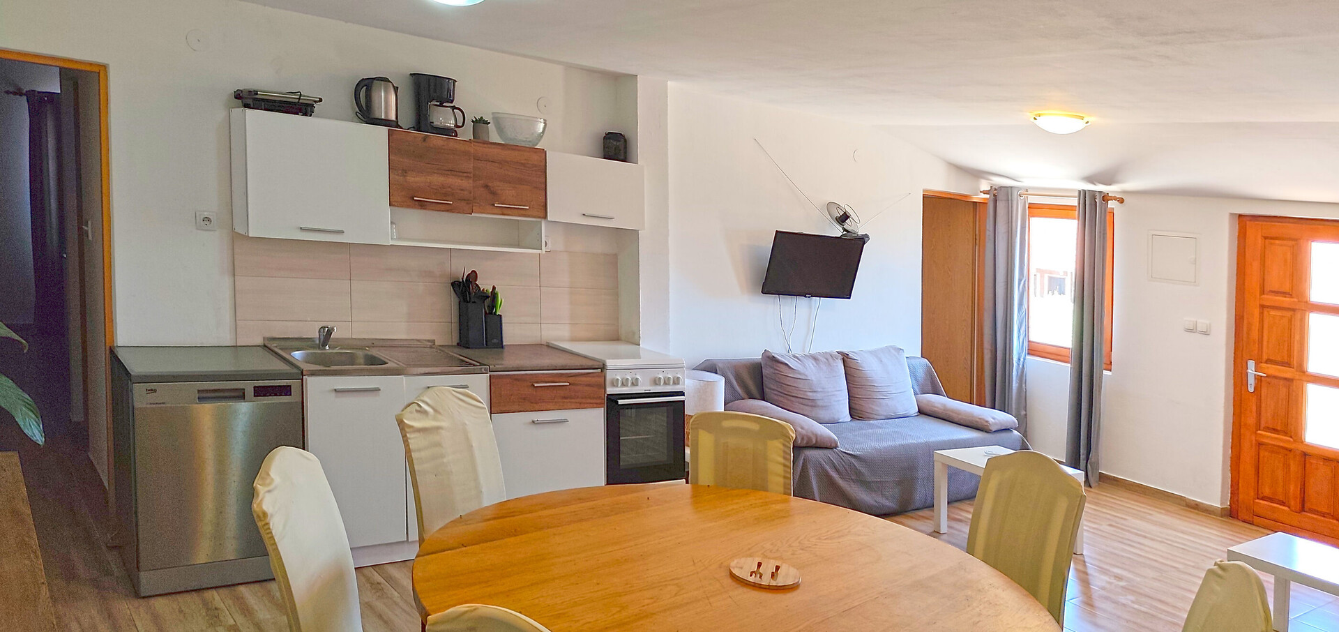 • table and chairs, kitchen sink, oven, refrigerator, upright freezer, electric kettle, filter coffee machine, microwave oven, dishwasher, stove cooktop.
