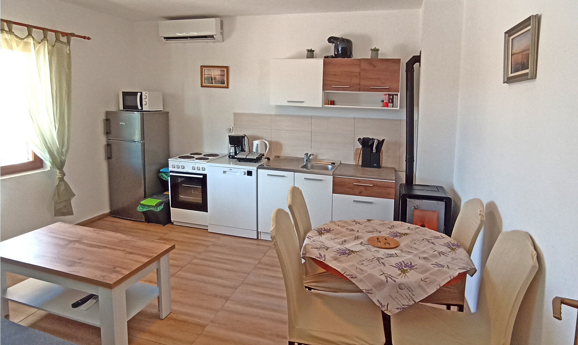 • table and chairs, kitchen sink, oven, refrigerator, upright freezer, electric kettle, filter coffee machine, dishwasher, stove cooktop.