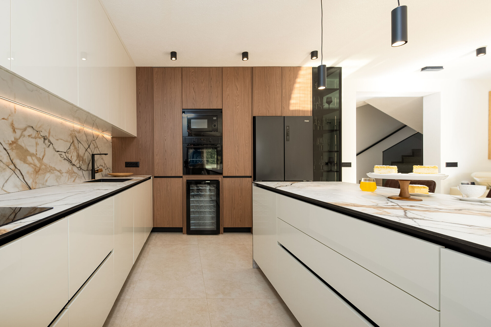 • table and chairs, kitchen sink, oven, refrigerator, upright freezer, electric kettle, filter coffee machine, microwave oven, toaster, iron, stove cooktop.