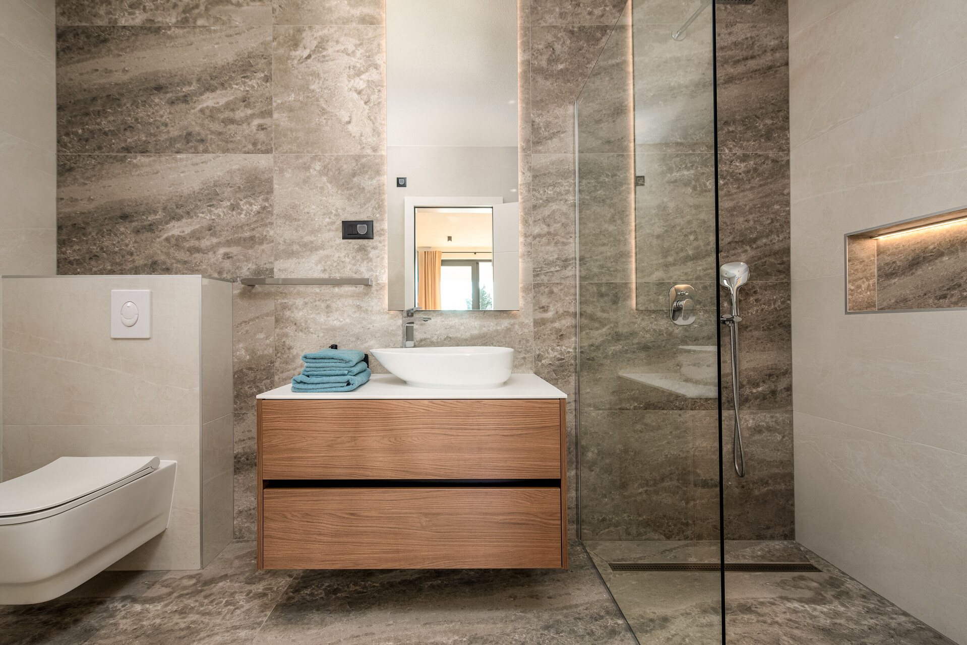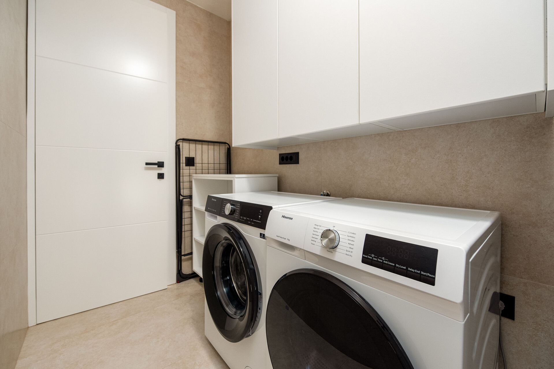 • shower, shower enclosure, washing machine, hairdryer, towels.