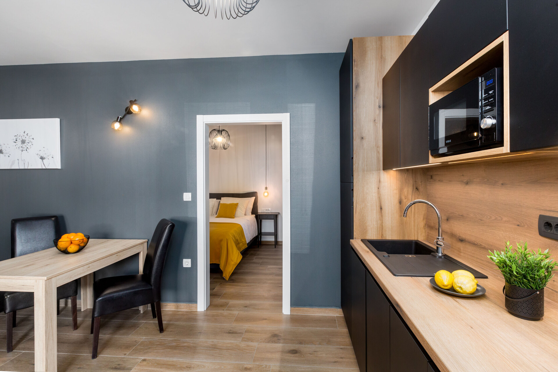 • stol i stolice, sudoper, hladnjak, aparat - kuhalo za vodu, aparat za filter kavu, mikrovalna, toster, stroj za pranje posuđa, ploča za kuhanje.