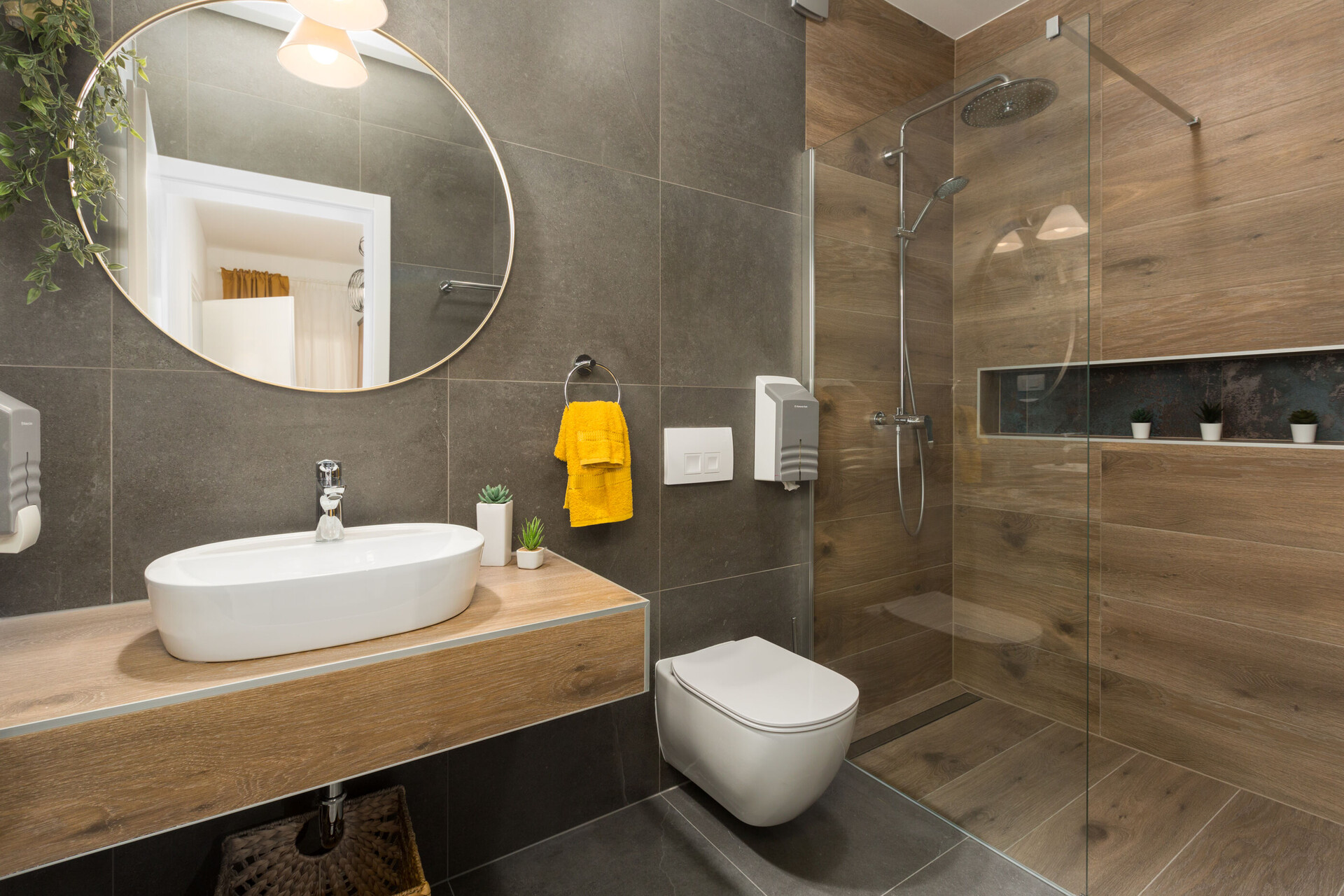 • tuš, tuš kabina, stroj za pranje rublja, fen, ručnici.