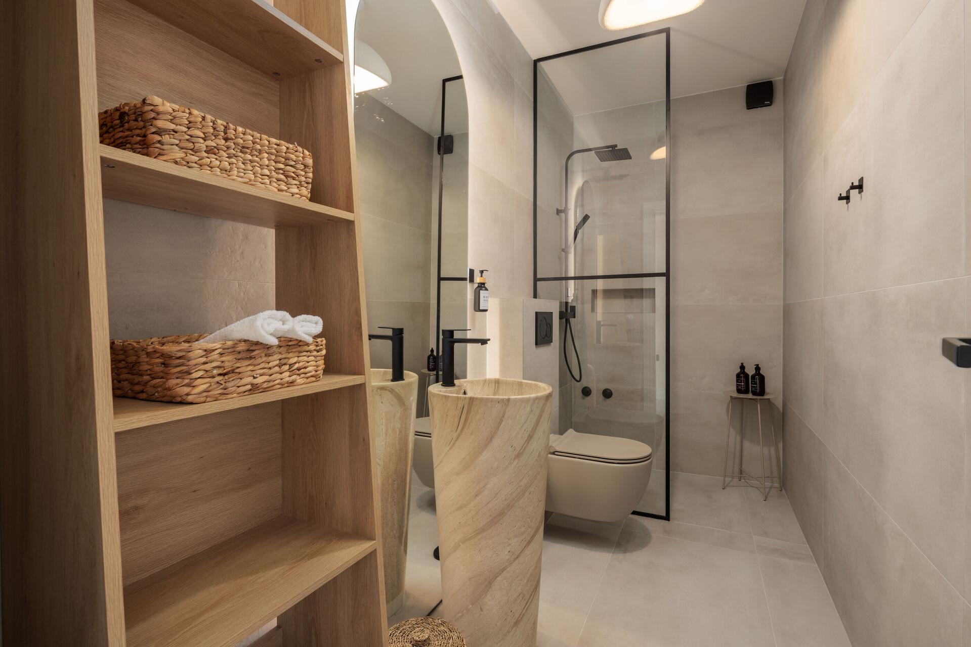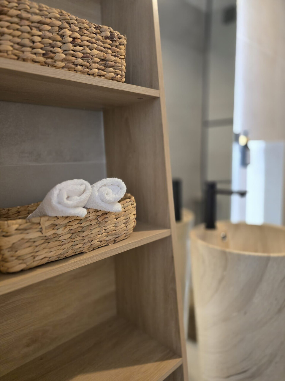 • tuš, tuš kabina, stroj za pranje rublja, fen, ručnici.
