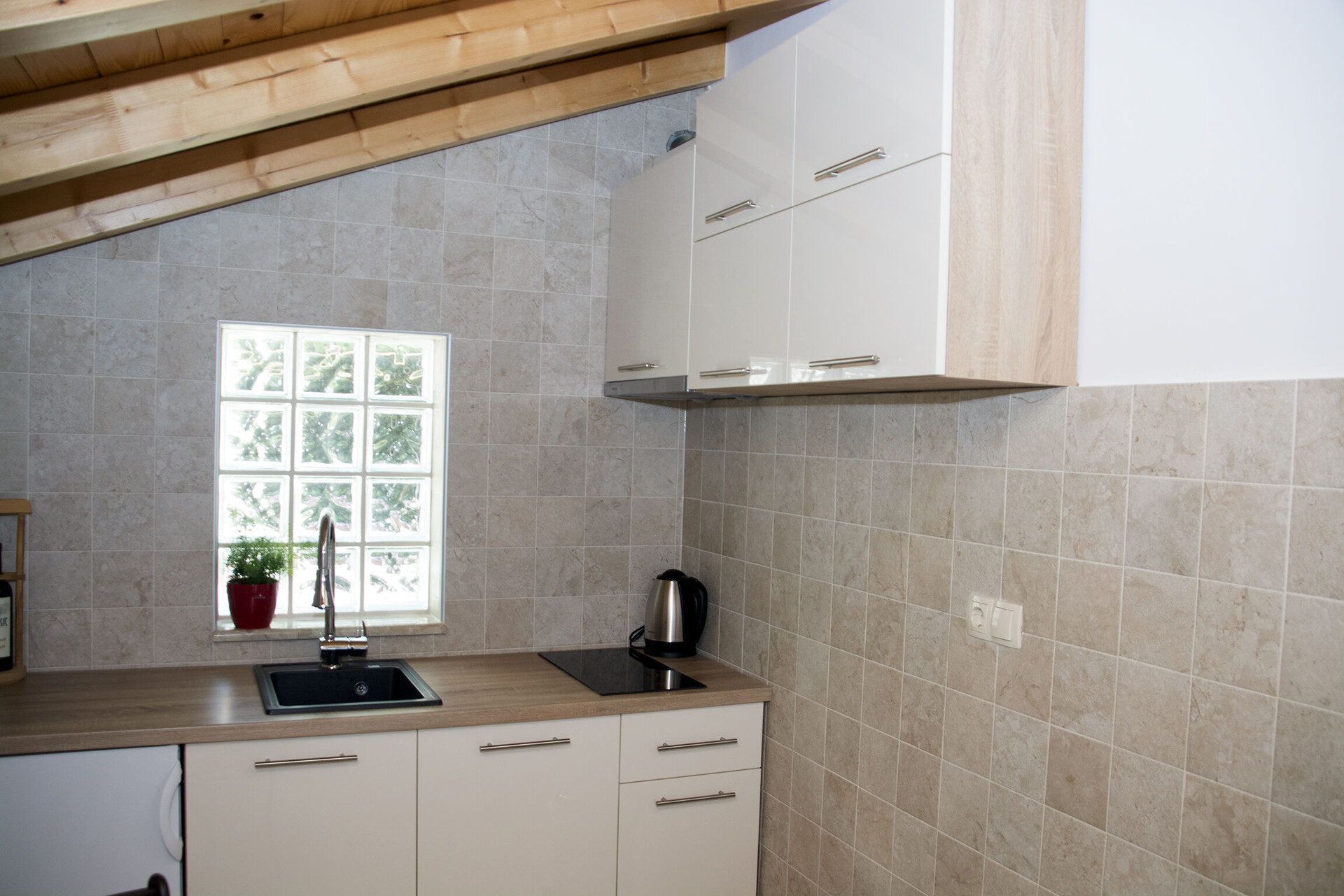 • asztal és székek, mosogató, hűtő, fagyasztó, vízforraló, tűzhely főzőlap.