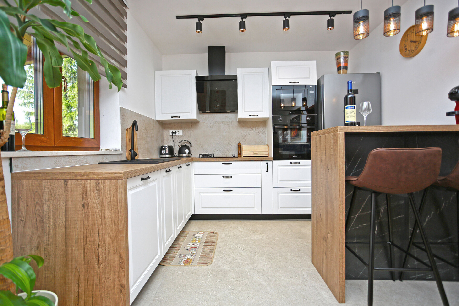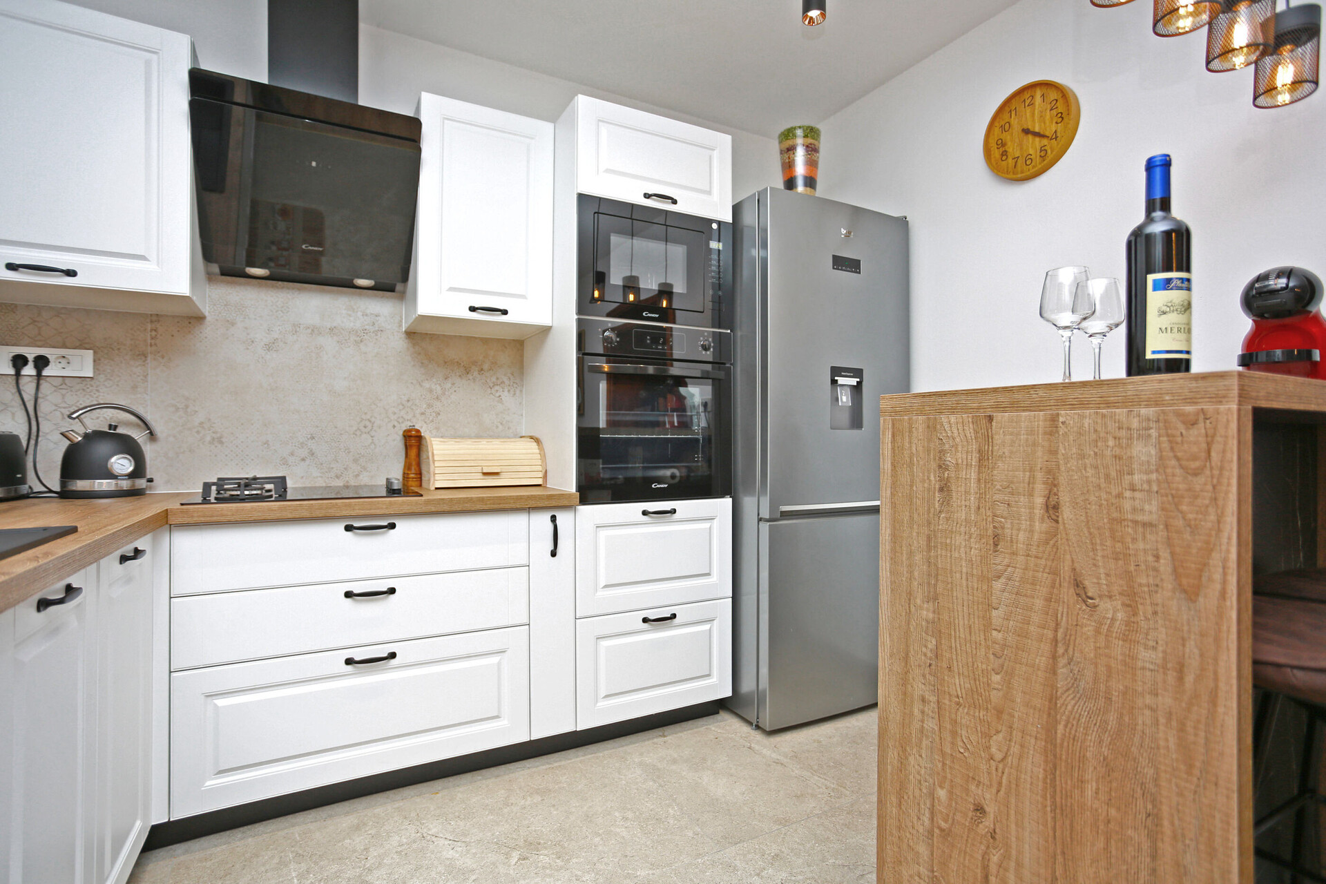 • asztal és székek, mosogató, sütő, hűtő, fagyasztó, vízforraló, filter kávé főző, mikrohullámú sütő, kenyér pirító, mosogató gép, vasaló, tűzhely főzőlap.