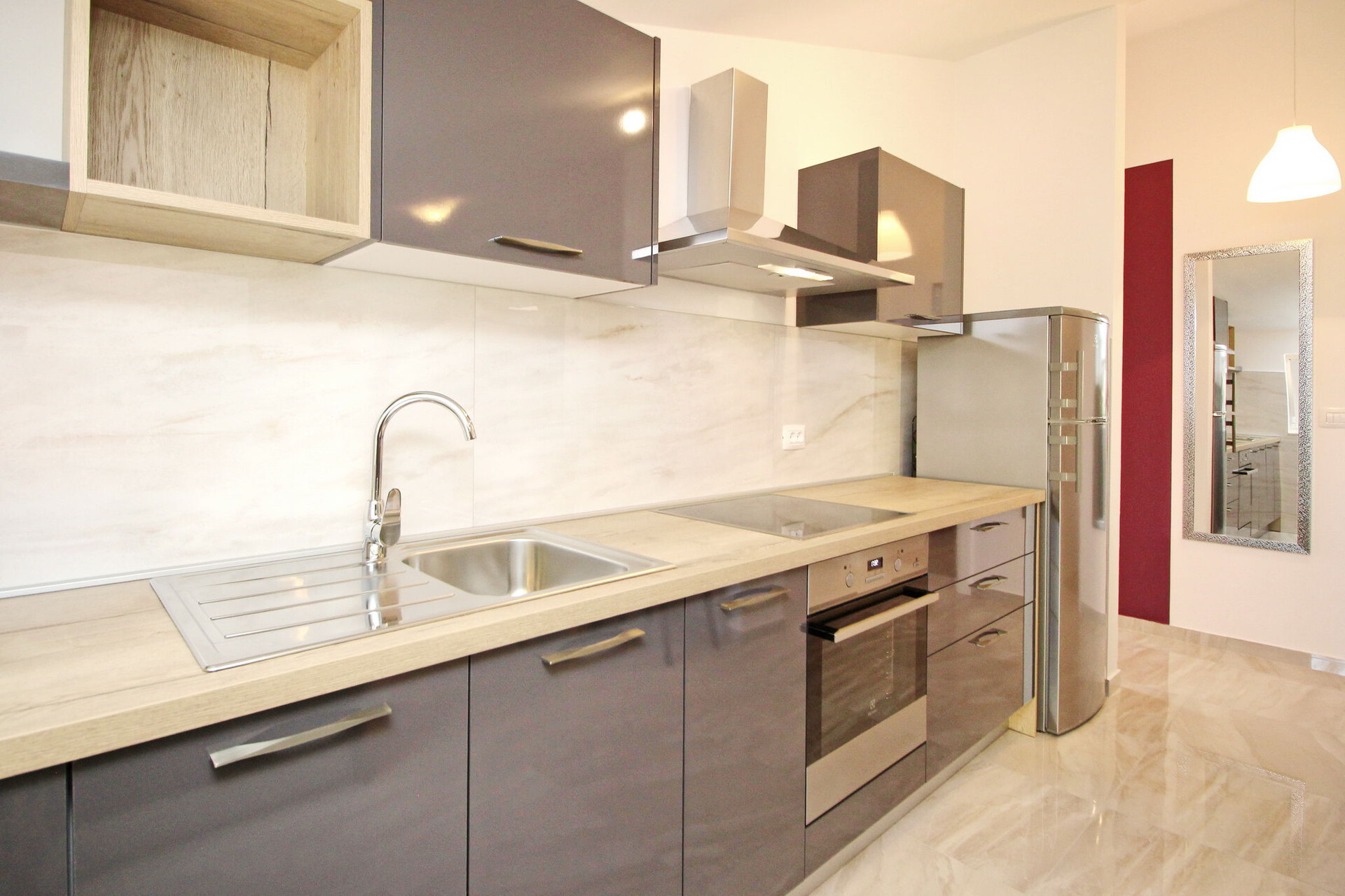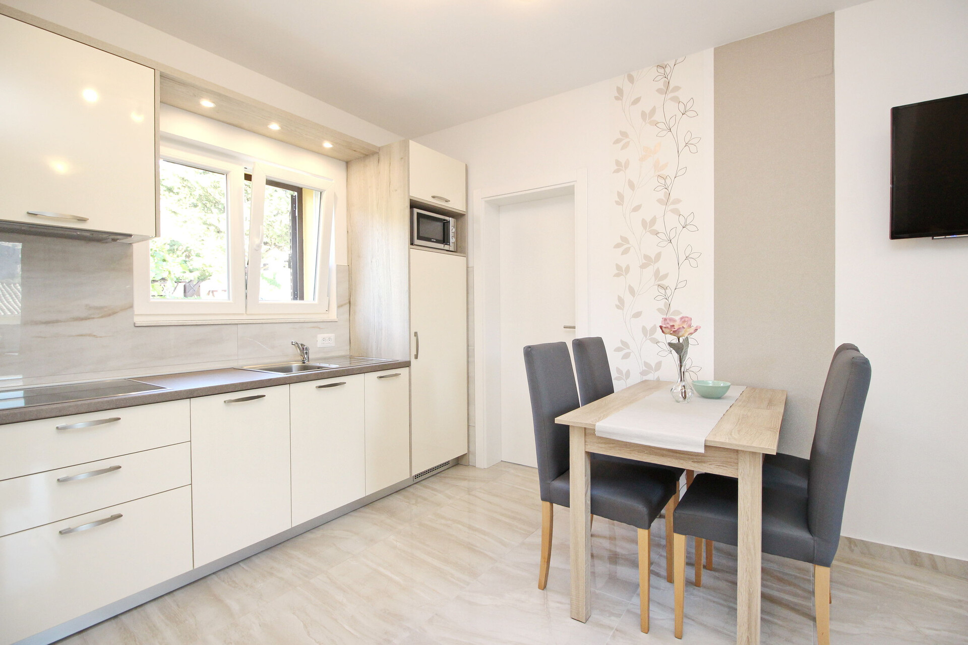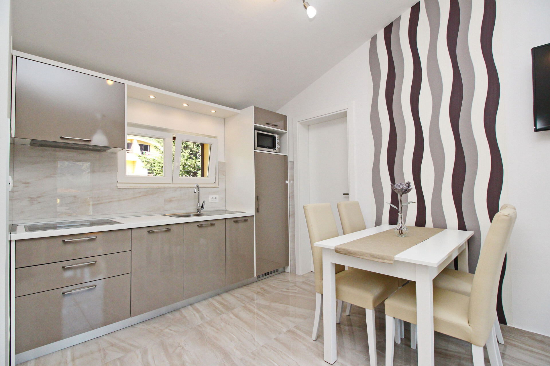 • asztal és székek, mosogató, hűtő, fagyasztó, vízforraló, filter kávé főző, mikrohullámú sütő, mosogató gép, tűzhely főzőlap.