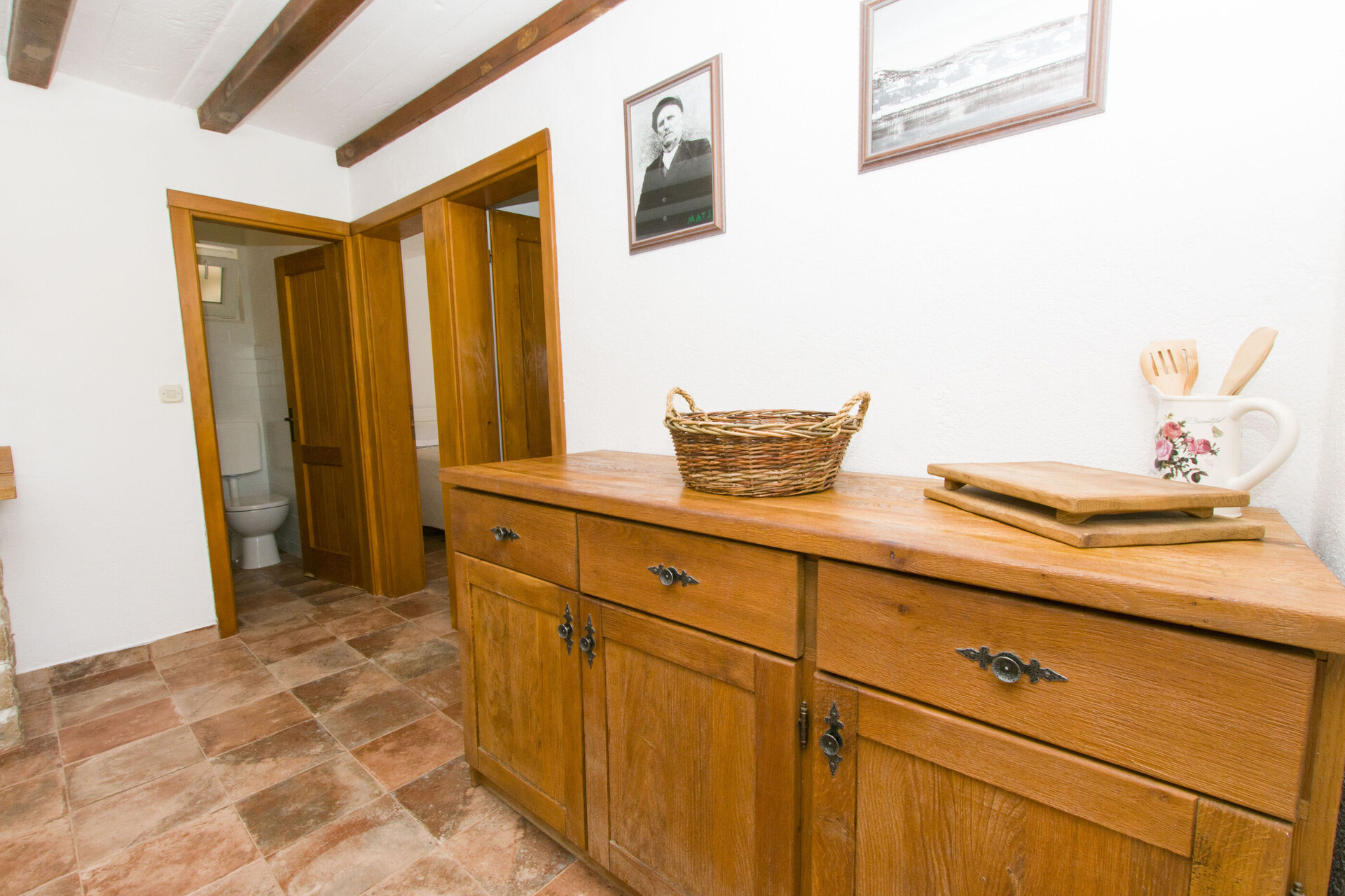 • asztal és székek, mosogató, hűtő, fagyasztó, tűzhely főzőlap.