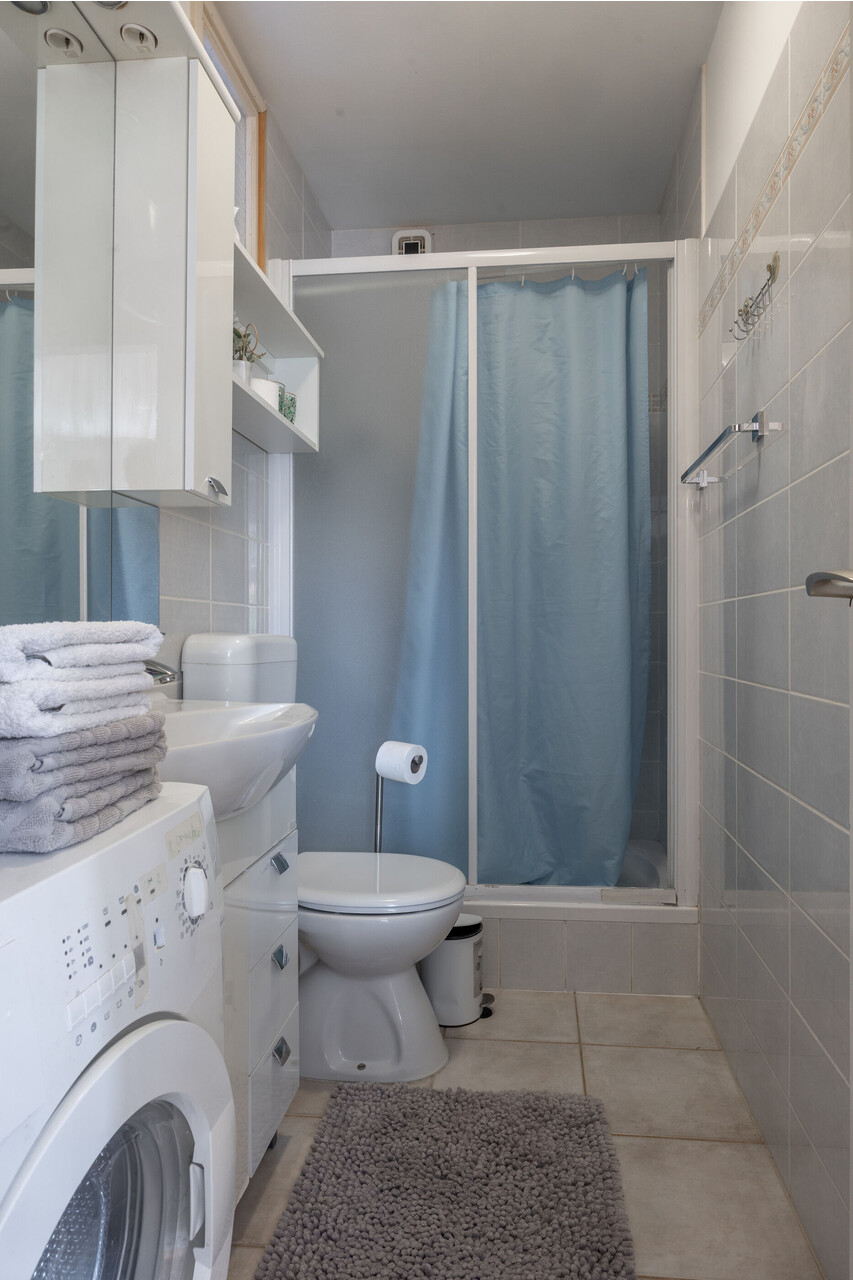 • la doccia, la cabina doccia, la lavatrice, l'asciugacapelli, gli asciugamani.