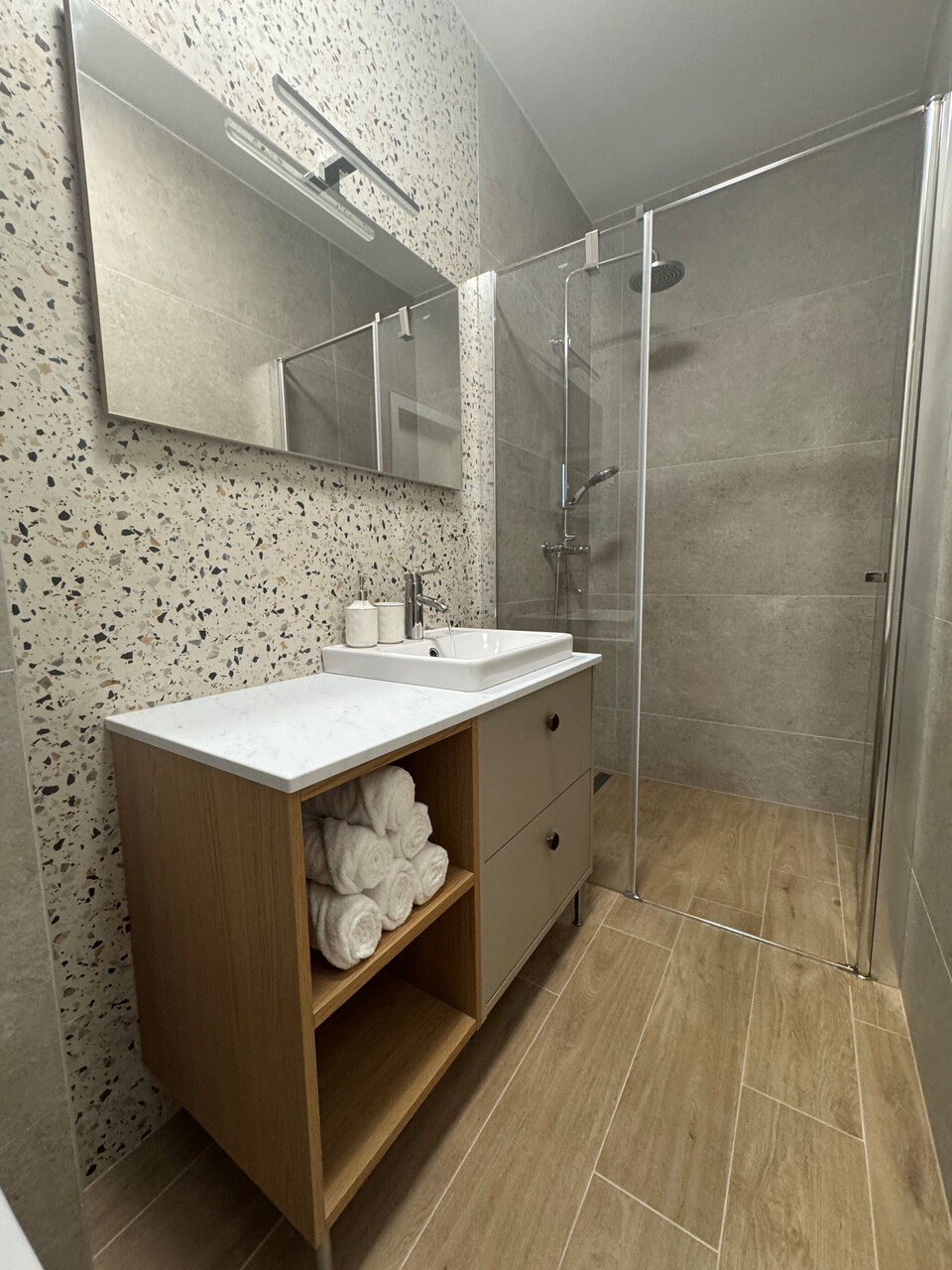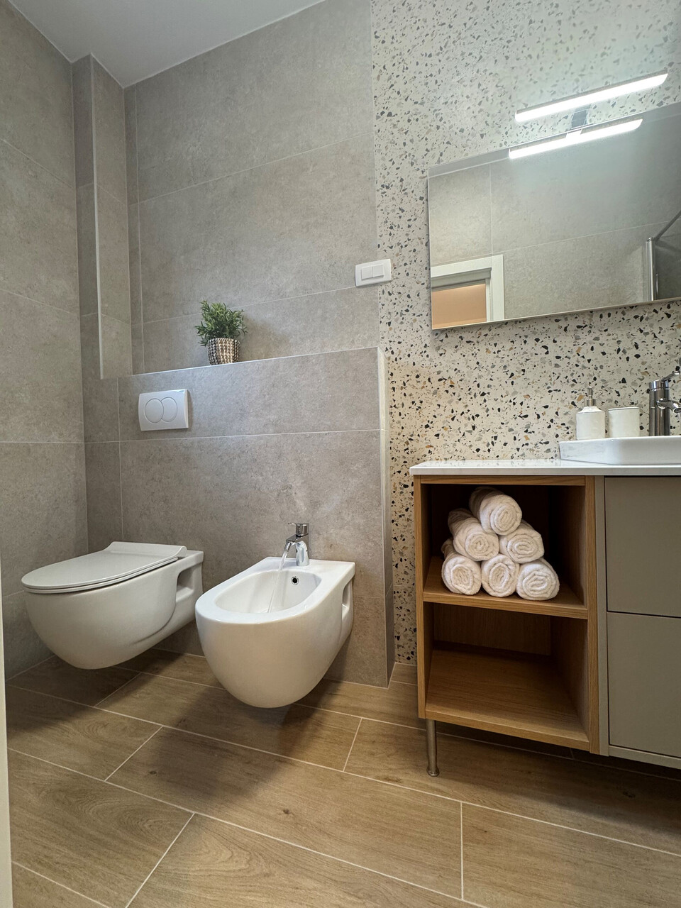 • la doccia, la cabina doccia, la lavatrice, l'asciugacapelli, gli asciugamani.