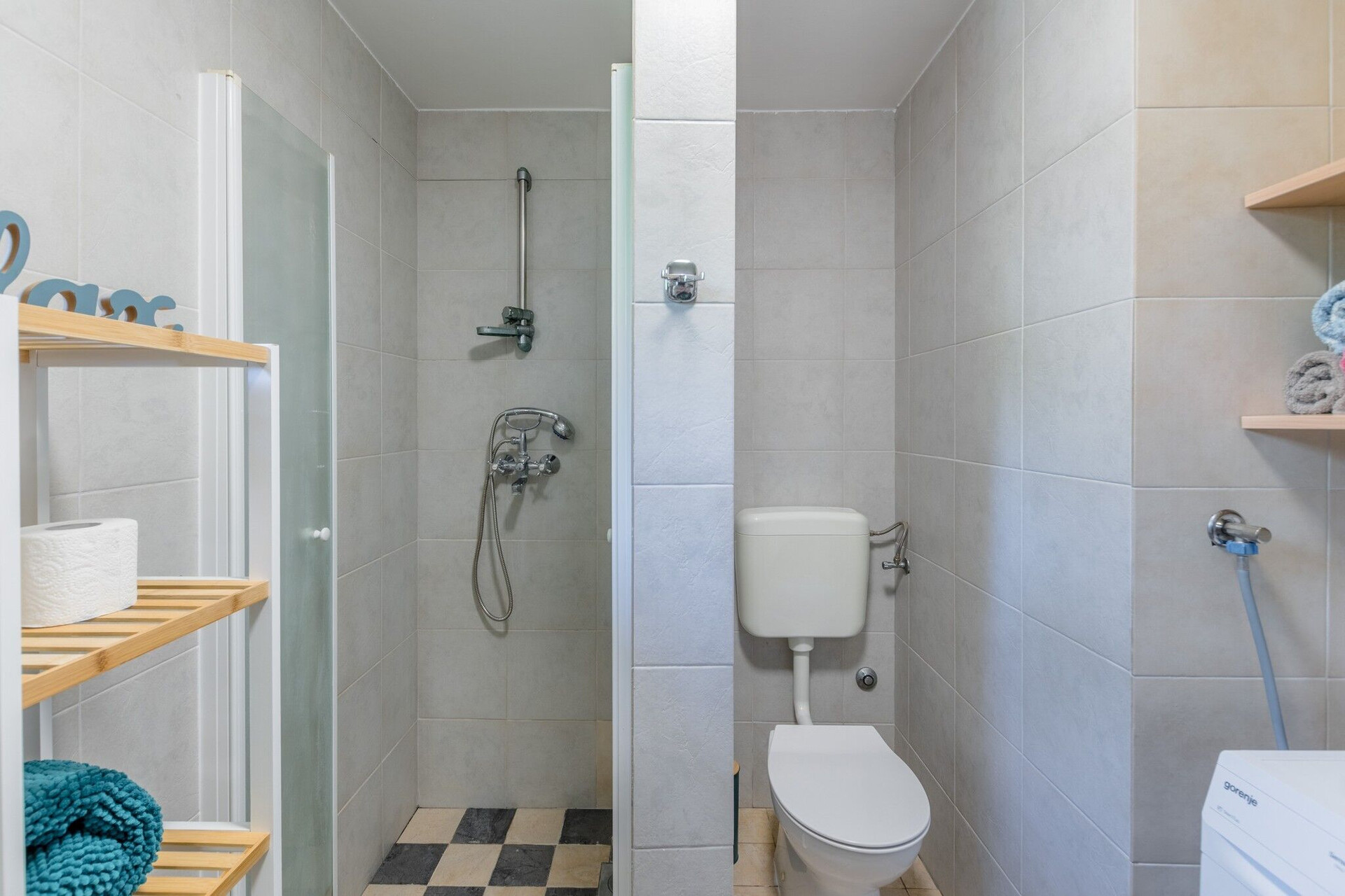 • la doccia, la cabina doccia, la lavatrice, l'asciugacapelli, gli asciugamani.
