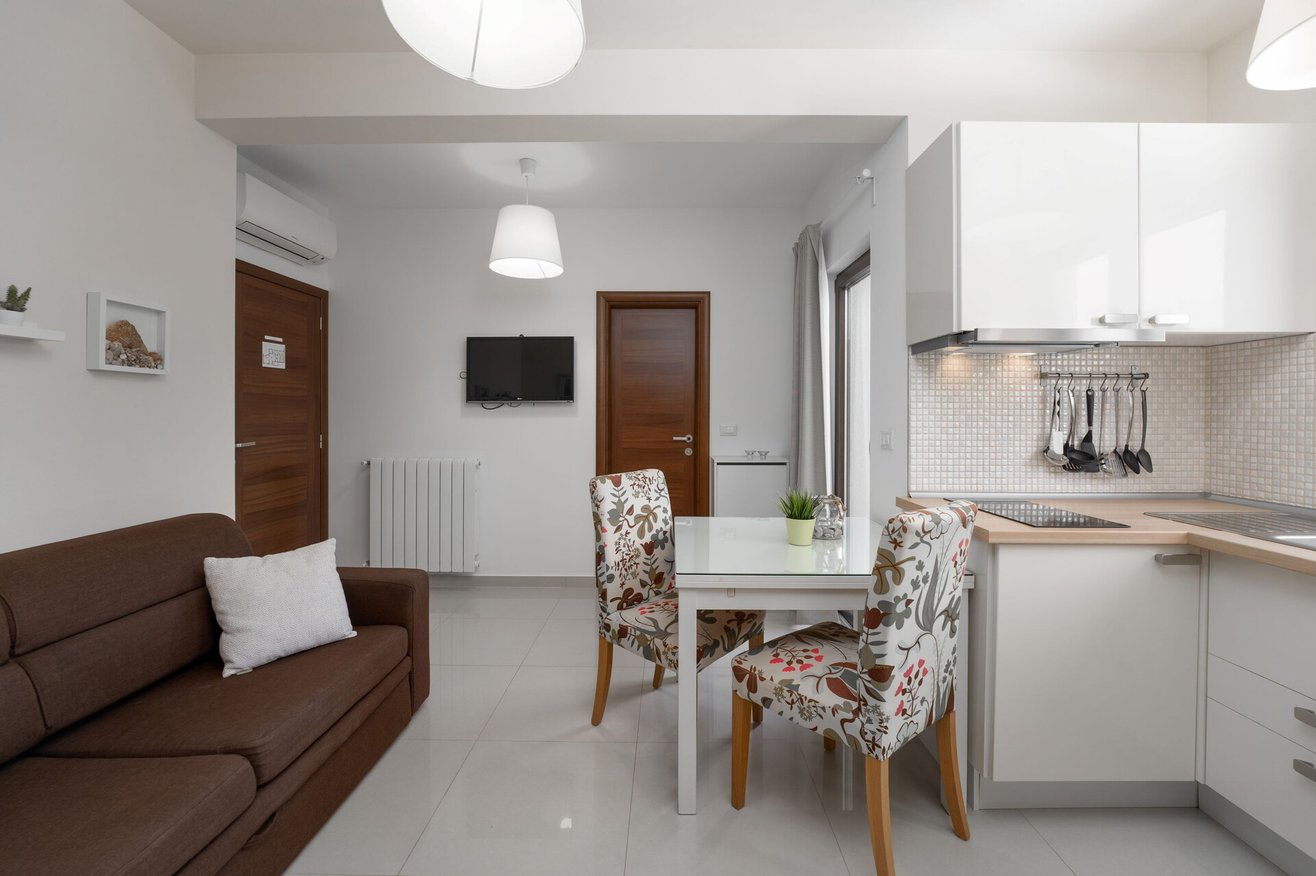 • маса и столчиња, лавабо, фрижидер, замрзнувач, апарат за варење на вода, апарат за филтар кафе, микровална, тостер, пегла, шпорет за готвење.