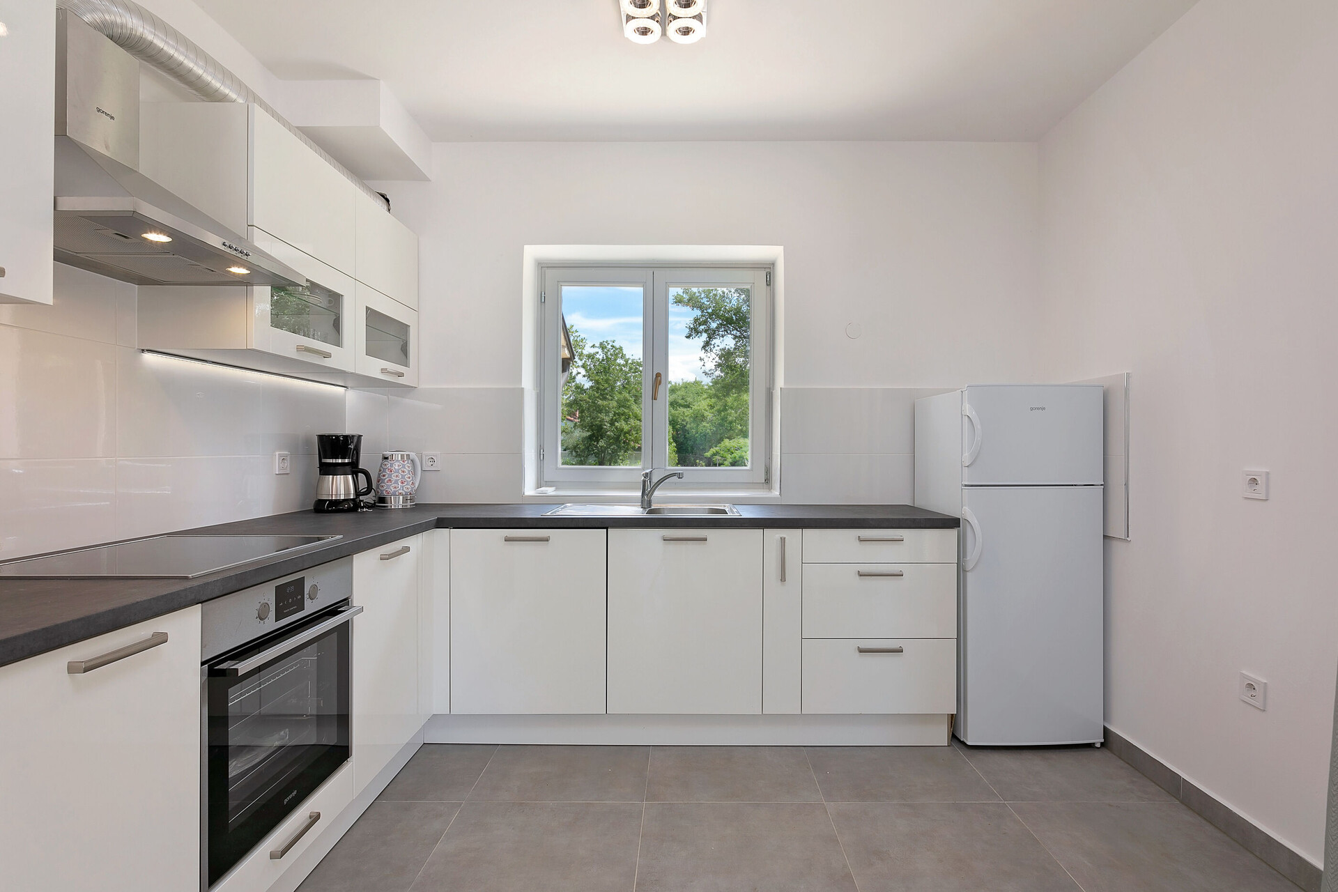 • маса и столчиња, лавабо, рерна, фрижидер, замрзнувач, апарат за варење на вода, апарат за филтар кафе, тостер, машина за миење садови, пегла, шпорет за готвење.