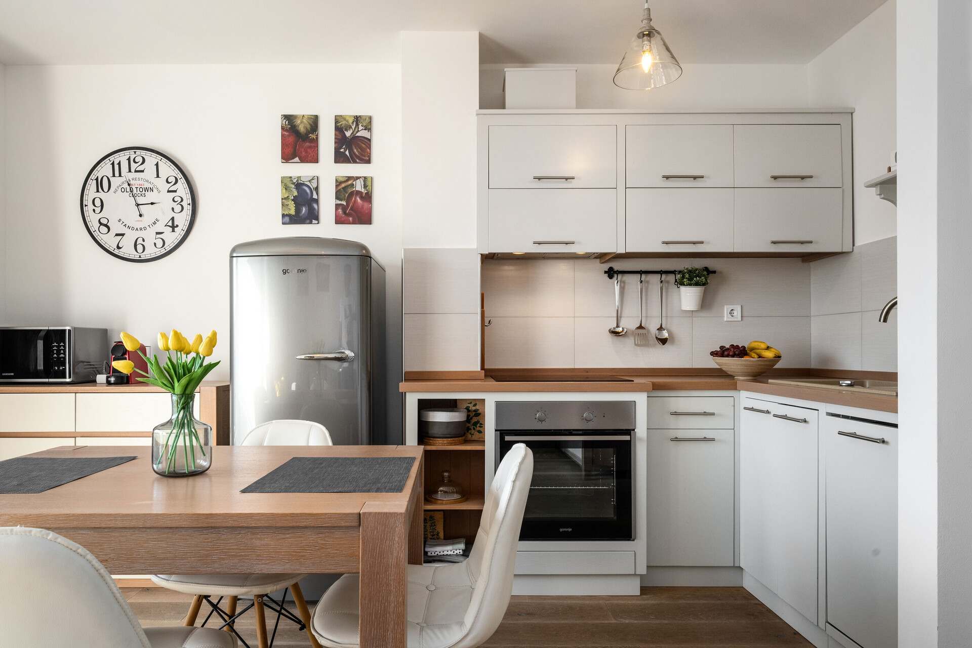 • маса и столчиња, лавабо, рерна, фрижидер, замрзнувач, апарат за варење на вода, апарат за филтар кафе, микровална, тостер, машина за миење садови, пегла, шпорет за готвење.