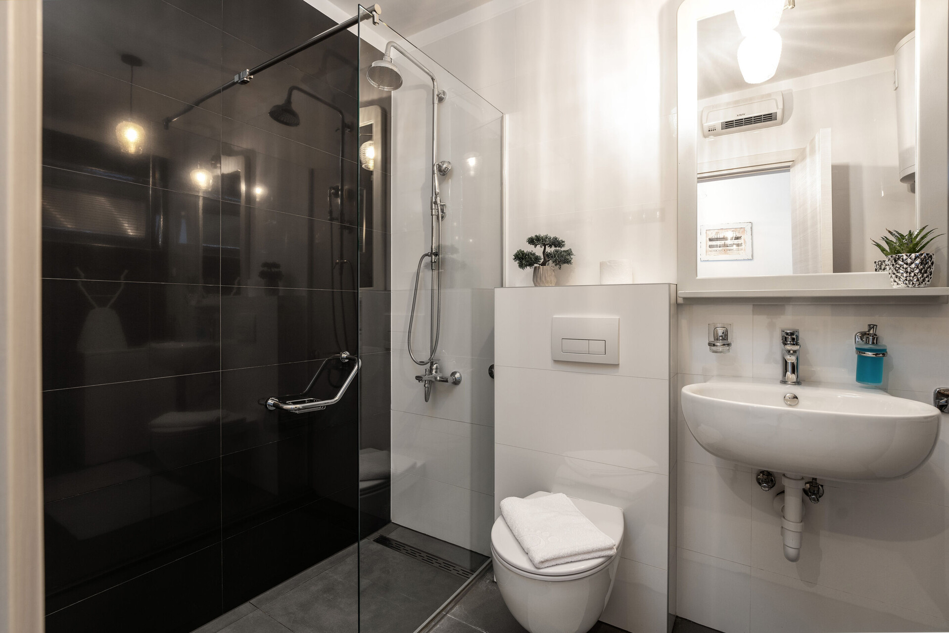 • туш, туш кабина, машина за перење, фен, пешкири.
