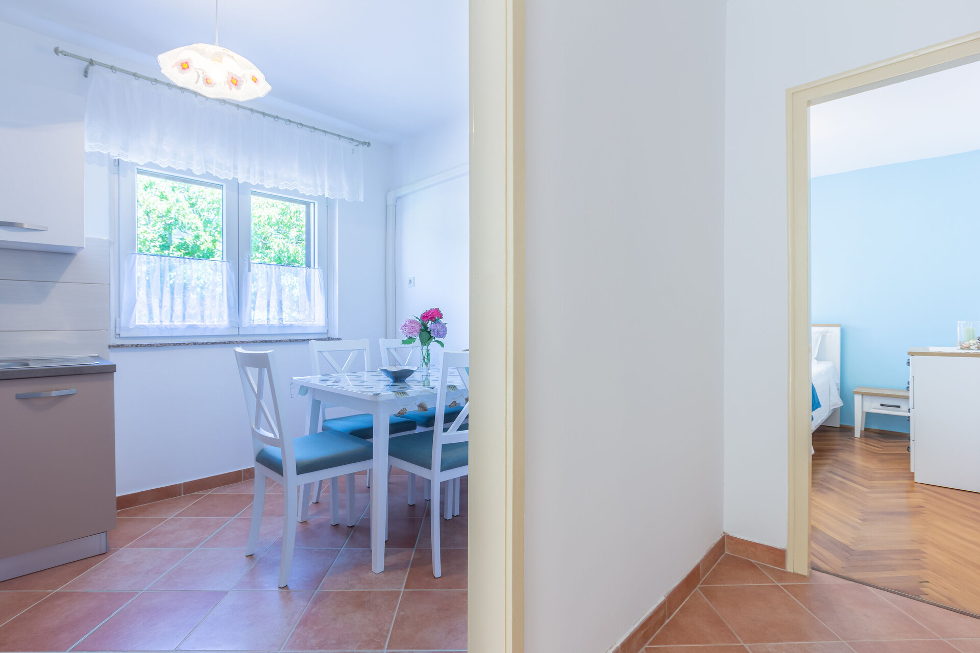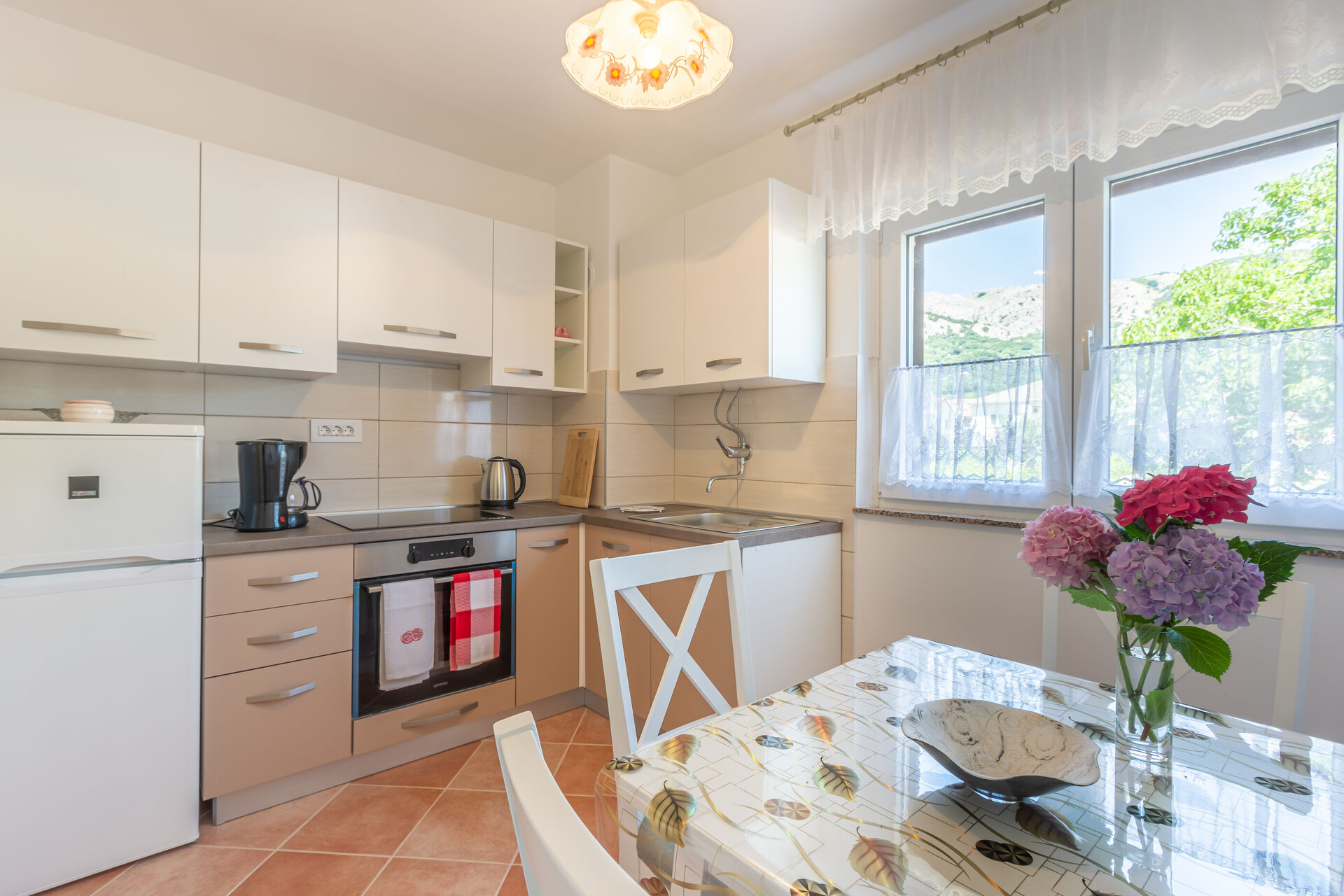 • маса и столчиња, лавабо, рерна, фрижидер, замрзнувач, апарат за варење на вода, апарат за филтар кафе, шпорет за готвење.