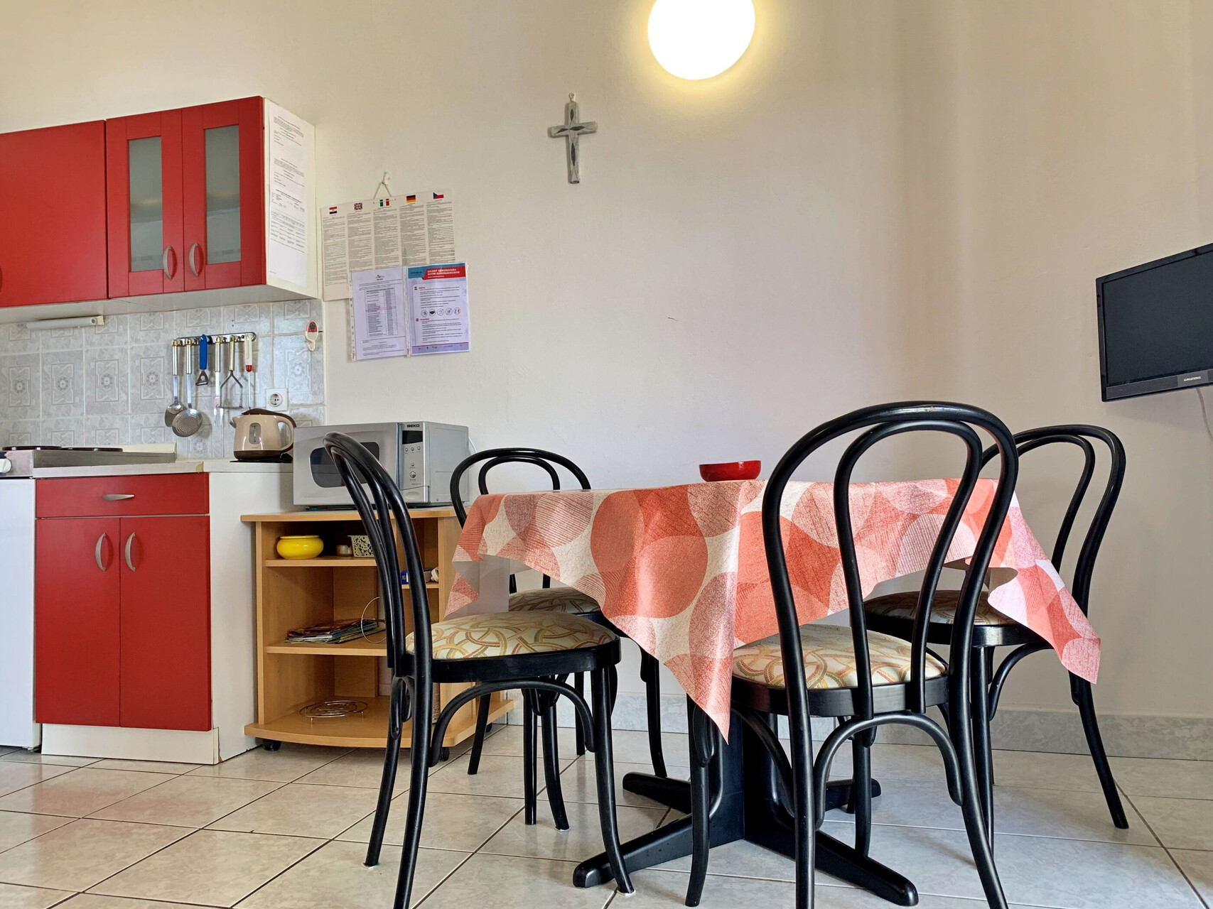 • маса и столчиња, лавабо, фрижидер, замрзнувач, апарат за филтар кафе, микровална, тостер, пегла, шпорет за готвење.