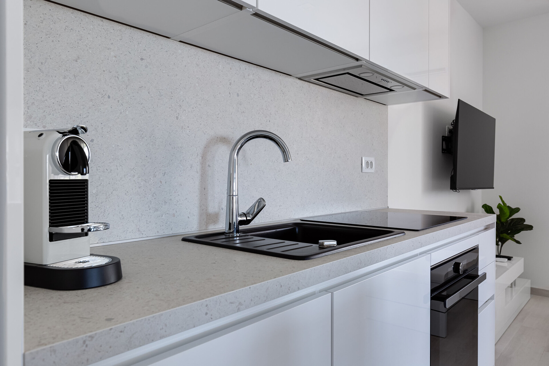 • маса и столчиња, лавабо, рерна, фрижидер, замрзнувач, апарат за варење на вода, апарат за филтар кафе, микровална, тостер, машина за миење садови, пегла, шпорет за готвење.