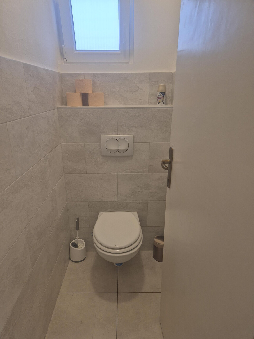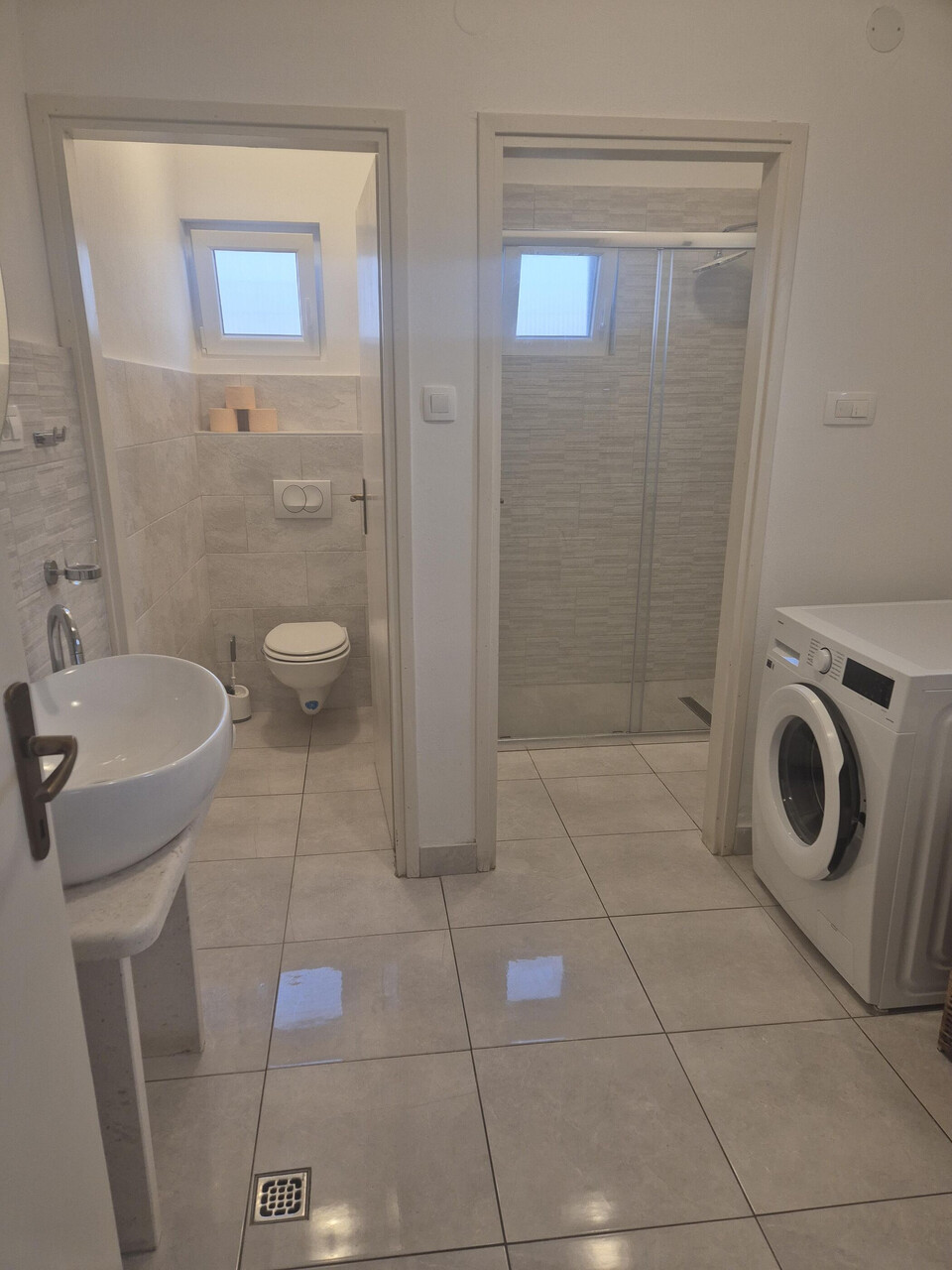 • туш, туш кабина, машина за перење, фен, пешкири.