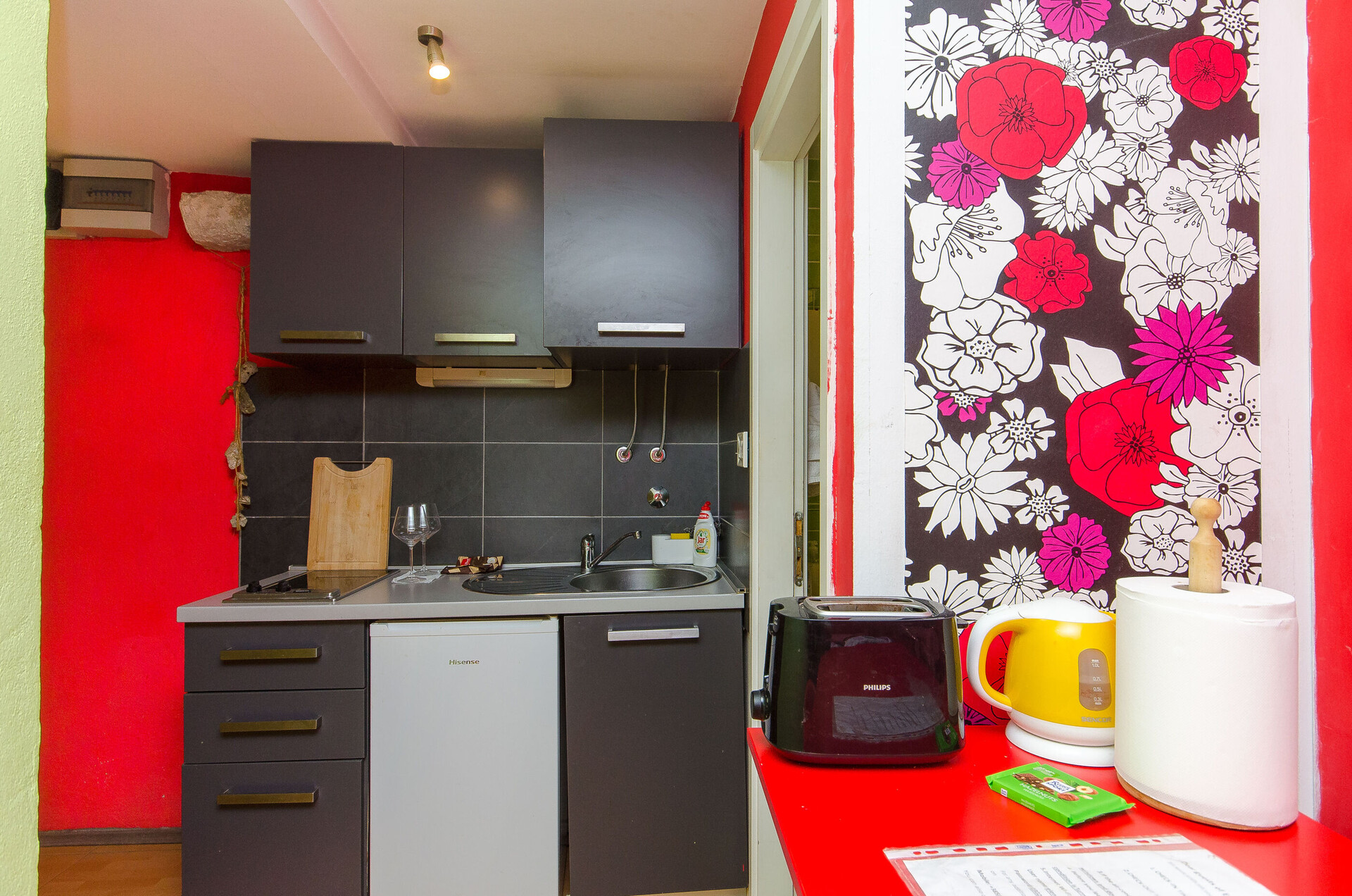 • маса и столчиња, лавабо, фрижидер, апарат за варење на вода, тостер, шпорет за готвење.