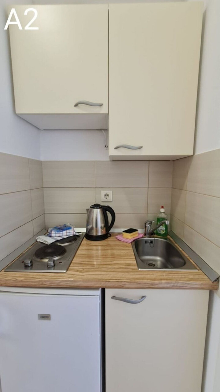 • маса и столчиња, лавабо, фрижидер, апарат за филтар кафе, пегла, шпорет за готвење.